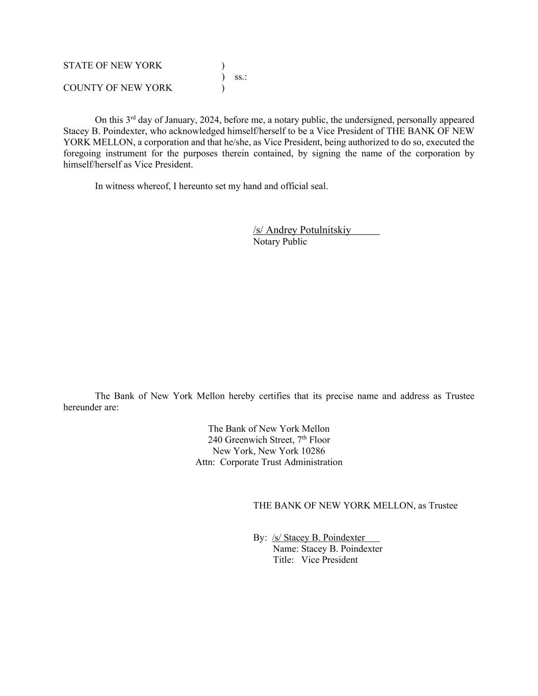 STATE OF NEW YORK ) ) ss.: COUNTY OF NEW YORK ) On this 3rd day of January, 2024, before me, a notary public, the undersigned, personally appeared Stacey B. Poindexter, who acknowledged himself/herself to be a Vice President of THE BANK OF NEW YORK MELLON, a corporation and that he/she, as Vice President, being authorized to do so, executed the foregoing instrument for the purposes therein contained, by signing the name of the corporation by himself/herself as Vice President. In witness whereof, I hereunto set my hand and official seal. /s/ Andrey Potulnitskiy Notary Public The Bank of New York Mellon hereby certifies that its precise name and address as Trustee hereunder are: The Bank of New York Mellon 240 Greenwich Street, 7th Floor New York, New York 10286 Attn: Corporate Trust Administration THE BANK OF NEW YORK MELLON, as Trustee By: /s/ Stacey B. Poindexter Name: Stacey B. Poindexter Title: Vice President