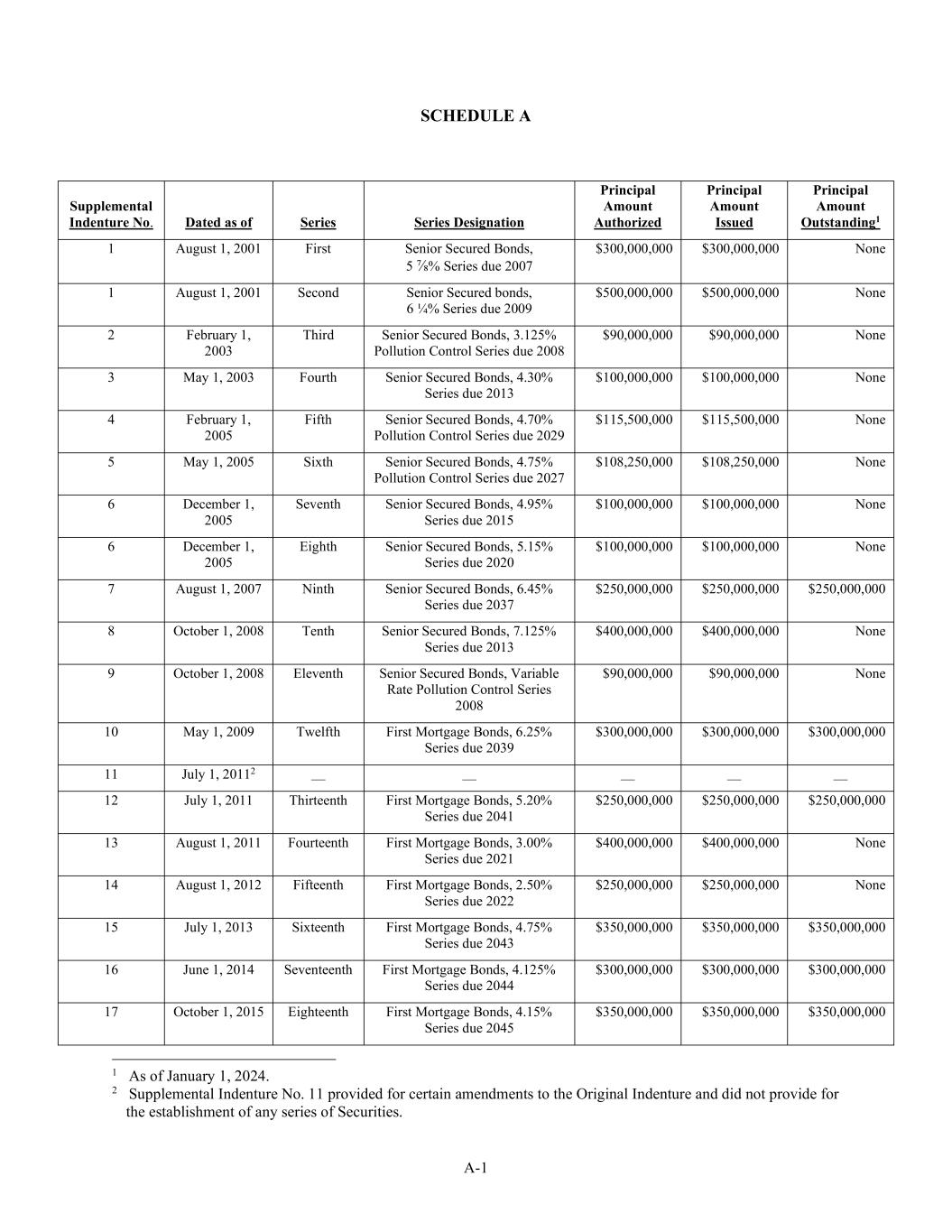 A-1 SCHEDULE A Supplemental Indenture No. Dated as of Series Series Designation Principal Amount Authorized Principal Amount Issued Principal Amount Outstanding1 1 August 1, 2001 First Senior Secured Bonds, 5 ⅞% Series due 2007 $300,000,000 $300,000,000 None 1 August 1, 2001 Second Senior Secured bonds, 6 ¼% Series due 2009 $500,000,000 $500,000,000 None 2 February 1, 2003 Third Senior Secured Bonds, 3.125% Pollution Control Series due 2008 $90,000,000 $90,000,000 None 3 May 1, 2003 Fourth Senior Secured Bonds, 4.30% Series due 2013 $100,000,000 $100,000,000 None 4 February 1, 2005 Fifth Senior Secured Bonds, 4.70% Pollution Control Series due 2029 $115,500,000 $115,500,000 None 5 May 1, 2005 Sixth Senior Secured Bonds, 4.75% Pollution Control Series due 2027 $108,250,000 $108,250,000 None 6 December 1, 2005 Seventh Senior Secured Bonds, 4.95% Series due 2015 $100,000,000 $100,000,000 None 6 December 1, 2005 Eighth Senior Secured Bonds, 5.15% Series due 2020 $100,000,000 $100,000,000 None 7 August 1, 2007 Ninth Senior Secured Bonds, 6.45% Series due 2037 $250,000,000 $250,000,000 $250,000,000 8 October 1, 2008 Tenth Senior Secured Bonds, 7.125% Series due 2013 $400,000,000 $400,000,000 None 9 October 1, 2008 Eleventh Senior Secured Bonds, Variable Rate Pollution Control Series 2008 $90,000,000 $90,000,000 None 10 May 1, 2009 Twelfth First Mortgage Bonds, 6.25% Series due 2039 $300,000,000 $300,000,000 $300,000,000 11 July 1, 20112 — — — — — 12 July 1, 2011 Thirteenth First Mortgage Bonds, 5.20% Series due 2041 $250,000,000 $250,000,000 $250,000,000 13 August 1, 2011 Fourteenth First Mortgage Bonds, 3.00% Series due 2021 $400,000,000 $400,000,000 None 14 August 1, 2012 Fifteenth First Mortgage Bonds, 2.50% Series due 2022 $250,000,000 $250,000,000 None 15 July 1, 2013 Sixteenth First Mortgage Bonds, 4.75% Series due 2043 $350,000,000 $350,000,000 $350,000,000 16 June 1, 2014 Seventeenth First Mortgage Bonds, 4.125% Series due 2044 $300,000,000 $300,000,000 $300,000,000 17 October 1, 2015 Eighteenth First Mortgage Bonds, 4.15% Series due 2045 $350,000,000 $350,000,000 $350,000,000 1 As of January 1, 2024. 2 Supplemental Indenture No. 11 provided for certain amendments to the Original Indenture and did not provide for the establishment of any series of Securities.