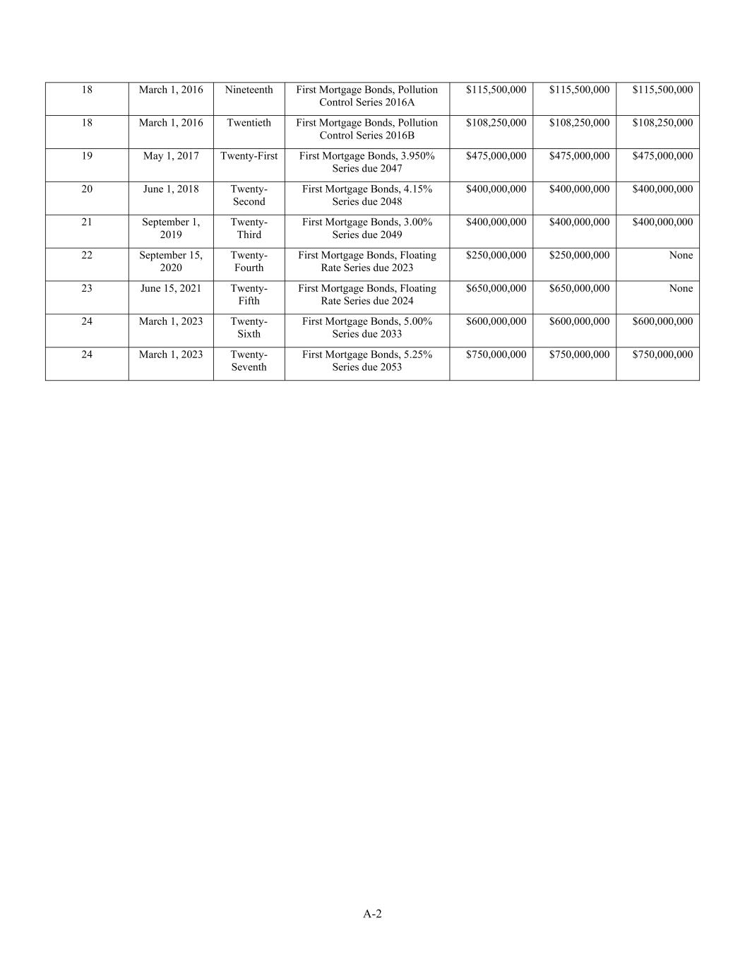 A-2 18 March 1, 2016 Nineteenth First Mortgage Bonds, Pollution Control Series 2016A $115,500,000 $115,500,000 $115,500,000 18 March 1, 2016 Twentieth First Mortgage Bonds, Pollution Control Series 2016B $108,250,000 $108,250,000 $108,250,000 19 May 1, 2017 Twenty-First First Mortgage Bonds, 3.950% Series due 2047 $475,000,000 $475,000,000 $475,000,000 20 June 1, 2018 Twenty- Second First Mortgage Bonds, 4.15% Series due 2048 $400,000,000 $400,000,000 $400,000,000 21 September 1, 2019 Twenty- Third First Mortgage Bonds, 3.00% Series due 2049 $400,000,000 $400,000,000 $400,000,000 22 September 15, 2020 Twenty- Fourth First Mortgage Bonds, Floating Rate Series due 2023 $250,000,000 $250,000,000 None 23 June 15, 2021 Twenty- Fifth First Mortgage Bonds, Floating Rate Series due 2024 $650,000,000 $650,000,000 None 24 March 1, 2023 Twenty- Sixth First Mortgage Bonds, 5.00% Series due 2033 $600,000,000 $600,000,000 $600,000,000 24 March 1, 2023 Twenty- Seventh First Mortgage Bonds, 5.25% Series due 2053 $750,000,000 $750,000,000 $750,000,000