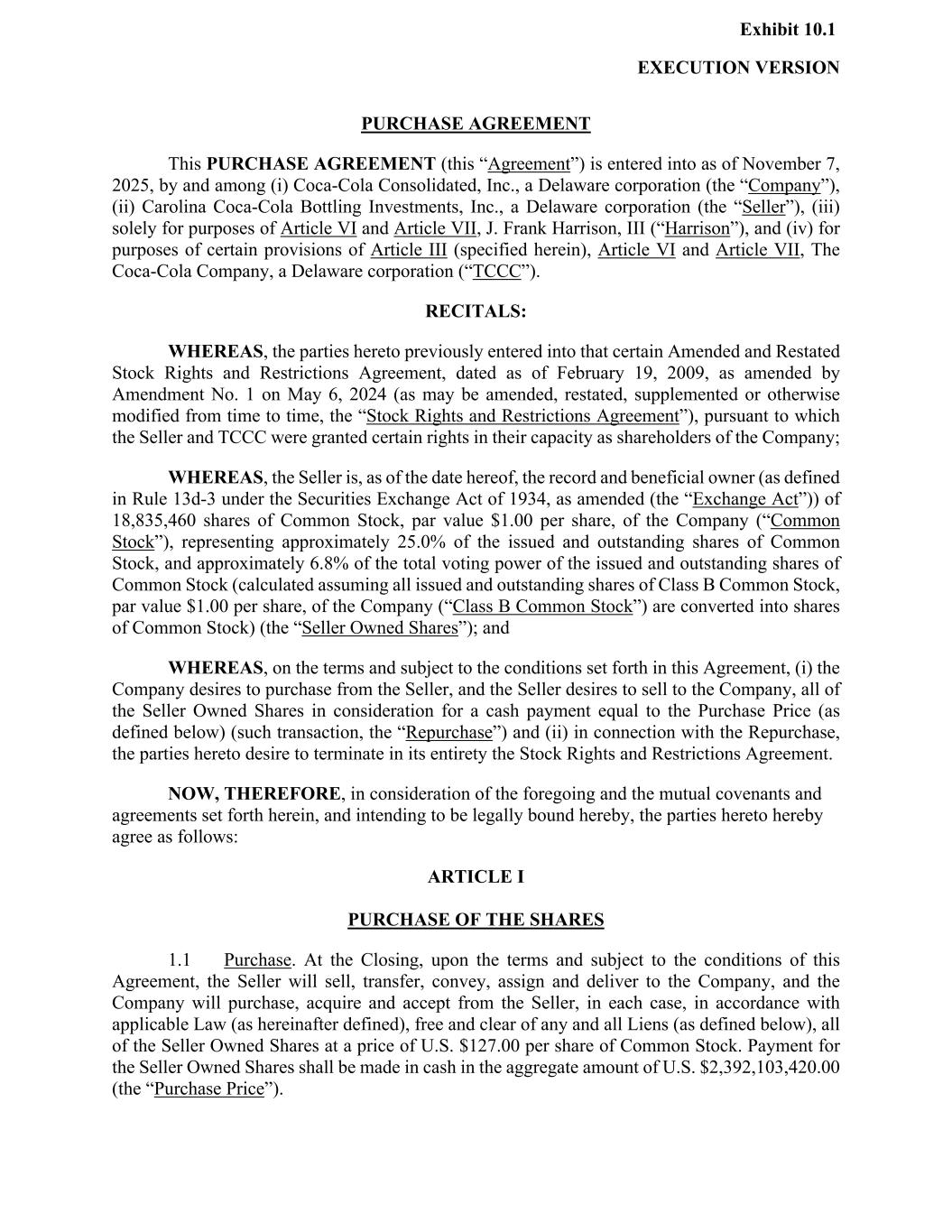 EXECUTION VERSION Exhibit 10.1 PURCHASE AGREEMENT This PURCHASE AGREEMENT (this “Agreement”) is entered into as of November 7, 2025, by and among (i) Coca-Cola Consolidated, Inc., a Delaware corporation (the “Company”), (ii) Carolina Coca-Cola Bottling Investments, Inc., a Delaware corporation (the “Seller”), (iii) solely for purposes of Article VI and Article VII, J. Frank Harrison, III (“Harrison”), and (iv) for purposes of certain provisions of Article III (specified herein), Article VI and Article VII, The Coca-Cola Company, a Delaware corporation (“TCCC”). RECITALS: WHEREAS, the parties hereto previously entered into that certain Amended and Restated Stock Rights and Restrictions Agreement, dated as of February 19, 2009, as amended by Amendment No. 1 on May 6, 2024 (as may be amended, restated, supplemented or otherwise modified from time to time, the “Stock Rights and Restrictions Agreement”), pursuant to which the Seller and TCCC were granted certain rights in their capacity as shareholders of the Company; WHEREAS, the Seller is, as of the date hereof, the record and beneficial owner (as defined in Rule 13d-3 under the Securities Exchange Act of 1934, as amended (the “Exchange Act”)) of 18,835,460 shares of Common Stock, par value $1.00 per share, of the Company (“Common Stock”), representing approximately 25.0% of the issued and outstanding shares of Common Stock, and approximately 6.8% of the total voting power of the issued and outstanding shares of Common Stock (calculated assuming all issued and outstanding shares of Class B Common Stock, par value $1.00 per share, of the Company (“Class B Common Stock”) are converted into shares of Common Stock) (the “Seller Owned Shares”); and WHEREAS, on the terms and subject to the conditions set forth in this Agreement, (i) the Company desires to purchase from the Seller, and the Seller desires to sell to the Company, all of the Seller Owned Shares in consideration for a cash payment equal to the Purchase Price (as defined below) (such transaction, the “Repurchase”) and (ii) in connection with the Repurchase, the parties hereto desire to terminate in its entirety the Stock Rights and Restrictions Agreement. NOW, THEREFORE, in consideration of the foregoing and the mutual covenants and agreements set forth herein, and intending to be legally bound hereby, the parties hereto hereby agree as follows: ARTICLE I PURCHASE OF THE SHARES 1.1 Purchase. At the Closing, upon the terms and subject to the conditions of this Agreement, the Seller will sell, transfer, convey, assign and deliver to the Company, and the Company will purchase, acquire and accept from the Seller, in each case, in accordance with applicable Law (as hereinafter defined), free and clear of any and all Liens (as defined below), all of the Seller Owned Shares at a price of U.S. $127.00 per share of Common Stock. Payment for the Seller Owned Shares shall be made in cash in the aggregate amount of U.S. $2,392,103,420.00 (the “Purchase Price”).