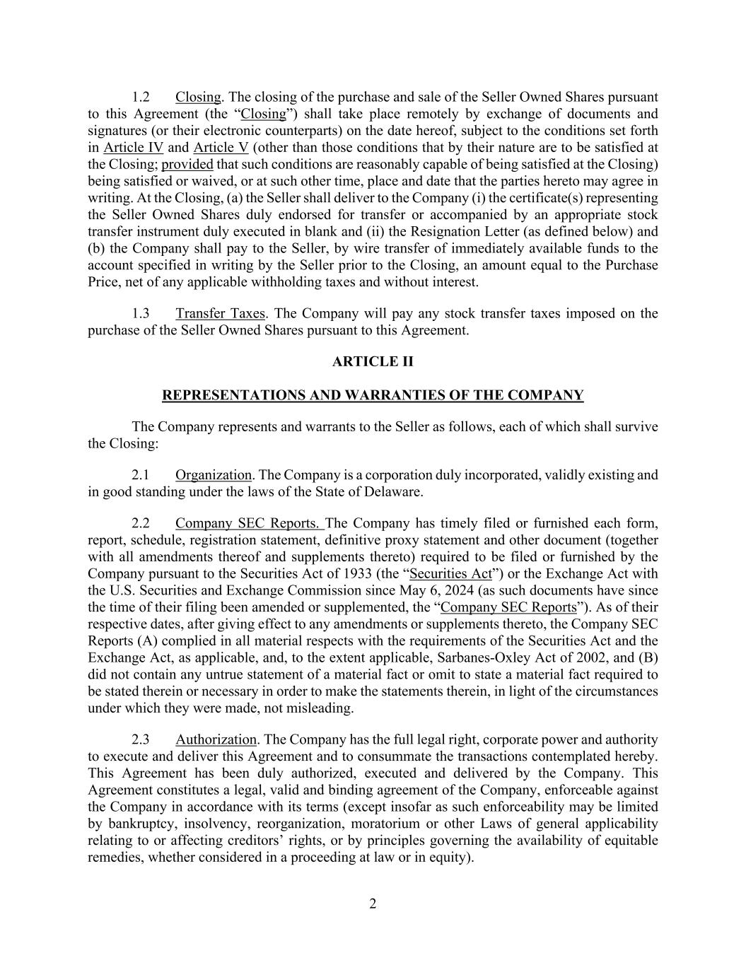 2 1.2 Closing. The closing of the purchase and sale of the Seller Owned Shares pursuant to this Agreement (the “Closing”) shall take place remotely by exchange of documents and signatures (or their electronic counterparts) on the date hereof, subject to the conditions set forth in Article IV and Article V (other than those conditions that by their nature are to be satisfied at the Closing; provided that such conditions are reasonably capable of being satisfied at the Closing) being satisfied or waived, or at such other time, place and date that the parties hereto may agree in writing. At the Closing, (a) the Seller shall deliver to the Company (i) the certificate(s) representing the Seller Owned Shares duly endorsed for transfer or accompanied by an appropriate stock transfer instrument duly executed in blank and (ii) the Resignation Letter (as defined below) and (b) the Company shall pay to the Seller, by wire transfer of immediately available funds to the account specified in writing by the Seller prior to the Closing, an amount equal to the Purchase Price, net of any applicable withholding taxes and without interest. 1.3 Transfer Taxes. The Company will pay any stock transfer taxes imposed on the purchase of the Seller Owned Shares pursuant to this Agreement. ARTICLE II REPRESENTATIONS AND WARRANTIES OF THE COMPANY The Company represents and warrants to the Seller as follows, each of which shall survive the Closing: 2.1 Organization. The Company is a corporation duly incorporated, validly existing and in good standing under the laws of the State of Delaware. 2.2 Company SEC Reports. The Company has timely filed or furnished each form, report, schedule, registration statement, definitive proxy statement and other document (together with all amendments thereof and supplements thereto) required to be filed or furnished by the Company pursuant to the Securities Act of 1933 (the “Securities Act”) or the Exchange Act with the U.S. Securities and Exchange Commission since May 6, 2024 (as such documents have since the time of their filing been amended or supplemented, the “Company SEC Reports”). As of their respective dates, after giving effect to any amendments or supplements thereto, the Company SEC Reports (A) complied in all material respects with the requirements of the Securities Act and the Exchange Act, as applicable, and, to the extent applicable, Sarbanes-Oxley Act of 2002, and (B) did not contain any untrue statement of a material fact or omit to state a material fact required to be stated therein or necessary in order to make the statements therein, in light of the circumstances under which they were made, not misleading. 2.3 Authorization. The Company has the full legal right, corporate power and authority to execute and deliver this Agreement and to consummate the transactions contemplated hereby. This Agreement has been duly authorized, executed and delivered by the Company. This Agreement constitutes a legal, valid and binding agreement of the Company, enforceable against the Company in accordance with its terms (except insofar as such enforceability may be limited by bankruptcy, insolvency, reorganization, moratorium or other Laws of general applicability relating to or affecting creditors’ rights, or by principles governing the availability of equitable remedies, whether considered in a proceeding at law or in equity).