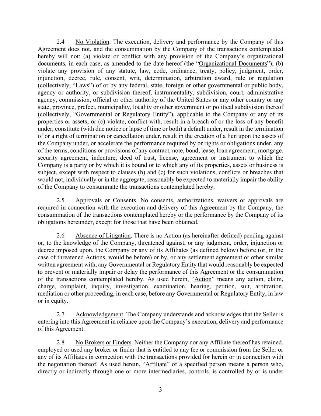 3 2.4 No Violation. The execution, delivery and performance by the Company of this Agreement does not, and the consummation by the Company of the transactions contemplated hereby will not: (a) violate or conflict with any provision of the Company’s organizational documents, in each case, as amended to the date hereof (the “Organizational Documents”); (b) violate any provision of any statute, law, code, ordinance, treaty, policy, judgment, order, injunction, decree, rule, consent, writ, determination, arbitration award, rule or regulation (collectively, “Laws”) of or by any federal, state, foreign or other governmental or public body, agency or authority, or subdivision thereof, instrumentality, subdivision, court, administrative agency, commission, official or other authority of the United States or any other country or any state, province, prefect, municipality, locality or other government or political subdivision thereof (collectively, “Governmental or Regulatory Entity”), applicable to the Company or any of its properties or assets; or (c) violate, conflict with, result in a breach of or the loss of any benefit under, constitute (with due notice or lapse of time or both) a default under, result in the termination of or a right of termination or cancellation under, result in the creation of a lien upon the assets of the Company under, or accelerate the performance required by or rights or obligations under, any of the terms, conditions or provisions of any contract, note, bond, lease, loan agreement, mortgage, security agreement, indenture, deed of trust, license, agreement or instrument to which the Company is a party or by which it is bound or to which any of its properties, assets or business is subject, except with respect to clauses (b) and (c) for such violations, conflicts or breaches that would not, individually or in the aggregate, reasonably be expected to materially impair the ability of the Company to consummate the transactions contemplated hereby. 2.5 Approvals or Consents. No consents, authorizations, waivers or approvals are required in connection with the execution and delivery of this Agreement by the Company, the consummation of the transactions contemplated hereby or the performance by the Company of its obligations hereunder, except for those that have been obtained. 2.6 Absence of Litigation. There is no Action (as hereinafter defined) pending against or, to the knowledge of the Company, threatened against, or any judgment, order, injunction or decree imposed upon, the Company or any of its Affiliates (as defined below) before (or, in the case of threatened Actions, would be before) or by, or any settlement agreement or other similar written agreement with, any Governmental or Regulatory Entity that would reasonably be expected to prevent or materially impair or delay the performance of this Agreement or the consummation of the transactions contemplated hereby. As used herein, “Action” means any action, claim, charge, complaint, inquiry, investigation, examination, hearing, petition, suit, arbitration, mediation or other proceeding, in each case, before any Governmental or Regulatory Entity, in law or in equity. 2.7 Acknowledgement. The Company understands and acknowledges that the Seller is entering into this Agreement in reliance upon the Company’s execution, delivery and performance of this Agreement. 2.8 No Brokers or Finders. Neither the Company nor any Affiliate thereof has retained, employed or used any broker or finder that is entitled to any fee or commission from the Seller or any of its Affiliates in connection with the transactions provided for herein or in connection with the negotiation thereof. As used herein, “Affiliate” of a specified person means a person who, directly or indirectly through one or more intermediaries, controls, is controlled by or is under