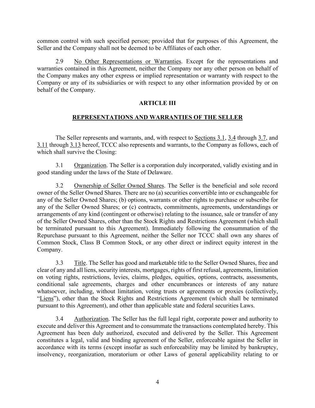 4 common control with such specified person; provided that for purposes of this Agreement, the Seller and the Company shall not be deemed to be Affiliates of each other. 2.9 No Other Representations or Warranties. Except for the representations and warranties contained in this Agreement, neither the Company nor any other person on behalf of the Company makes any other express or implied representation or warranty with respect to the Company or any of its subsidiaries or with respect to any other information provided by or on behalf of the Company. ARTICLE III REPRESENTATIONS AND WARRANTIES OF THE SELLER The Seller represents and warrants, and, with respect to Sections 3.1, 3.4 through 3.7, and 3.11 through 3.13 hereof, TCCC also represents and warrants, to the Company as follows, each of which shall survive the Closing: 3.1 Organization. The Seller is a corporation duly incorporated, validly existing and in good standing under the laws of the State of Delaware. 3.2 Ownership of Seller Owned Shares. The Seller is the beneficial and sole record owner of the Seller Owned Shares. There are no (a) securities convertible into or exchangeable for any of the Seller Owned Shares; (b) options, warrants or other rights to purchase or subscribe for any of the Seller Owned Shares; or (c) contracts, commitments, agreements, understandings or arrangements of any kind (contingent or otherwise) relating to the issuance, sale or transfer of any of the Seller Owned Shares, other than the Stock Rights and Restrictions Agreement (which shall be terminated pursuant to this Agreement). Immediately following the consummation of the Repurchase pursuant to this Agreement, neither the Seller nor TCCC shall own any shares of Common Stock, Class B Common Stock, or any other direct or indirect equity interest in the Company. 3.3 Title. The Seller has good and marketable title to the Seller Owned Shares, free and clear of any and all liens, security interests, mortgages, rights of first refusal, agreements, limitation on voting rights, restrictions, levies, claims, pledges, equities, options, contracts, assessments, conditional sale agreements, charges and other encumbrances or interests of any nature whatsoever, including, without limitation, voting trusts or agreements or proxies (collectively, “Liens”), other than the Stock Rights and Restrictions Agreement (which shall be terminated pursuant to this Agreement), and other than applicable state and federal securities Laws. 3.4 Authorization. The Seller has the full legal right, corporate power and authority to execute and deliver this Agreement and to consummate the transactions contemplated hereby. This Agreement has been duly authorized, executed and delivered by the Seller. This Agreement constitutes a legal, valid and binding agreement of the Seller, enforceable against the Seller in accordance with its terms (except insofar as such enforceability may be limited by bankruptcy, insolvency, reorganization, moratorium or other Laws of general applicability relating to or