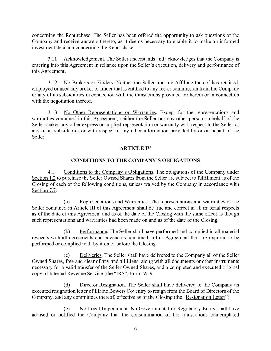 6 concerning the Repurchase. The Seller has been offered the opportunity to ask questions of the Company and receive answers thereto, as it deems necessary to enable it to make an informed investment decision concerning the Repurchase. 3.11 Acknowledgement. The Seller understands and acknowledges that the Company is entering into this Agreement in reliance upon the Seller’s execution, delivery and performance of this Agreement. 3.12 No Brokers or Finders. Neither the Seller nor any Affiliate thereof has retained, employed or used any broker or finder that is entitled to any fee or commission from the Company or any of its subsidiaries in connection with the transactions provided for herein or in connection with the negotiation thereof. 3.13 No Other Representations or Warranties. Except for the representations and warranties contained in this Agreement, neither the Seller nor any other person on behalf of the Seller makes any other express or implied representation or warranty with respect to the Seller or any of its subsidiaries or with respect to any other information provided by or on behalf of the Seller. ARTICLE IV CONDITIONS TO THE COMPANY’S OBLIGATIONS 4.1 Conditions to the Company’s Obligations. The obligations of the Company under Section 1.2 to purchase the Seller Owned Shares from the Seller are subject to fulfillment as of the Closing of each of the following conditions, unless waived by the Company in accordance with Section 7.7: (a) Representations and Warranties. The representations and warranties of the Seller contained in Article III of this Agreement shall be true and correct in all material respects as of the date of this Agreement and as of the date of the Closing with the same effect as though such representations and warranties had been made on and as of the date of the Closing. (b) Performance. The Seller shall have performed and complied in all material respects with all agreements and covenants contained in this Agreement that are required to be performed or complied with by it on or before the Closing. (c) Deliveries. The Seller shall have delivered to the Company all of the Seller Owned Shares, free and clear of any and all Liens, along with all documents or other instruments necessary for a valid transfer of the Seller Owned Shares, and a completed and executed original copy of Internal Revenue Service (the “IRS”) Form W-9. (d) Director Resignation. The Seller shall have delivered to the Company an executed resignation letter of Elaine Bowers Coventry to resign from the Board of Directors of the Company, and any committees thereof, effective as of the Closing (the “Resignation Letter”). (e) No Legal Impediment. No Governmental or Regulatory Entity shall have advised or notified the Company that the consummation of the transactions contemplated