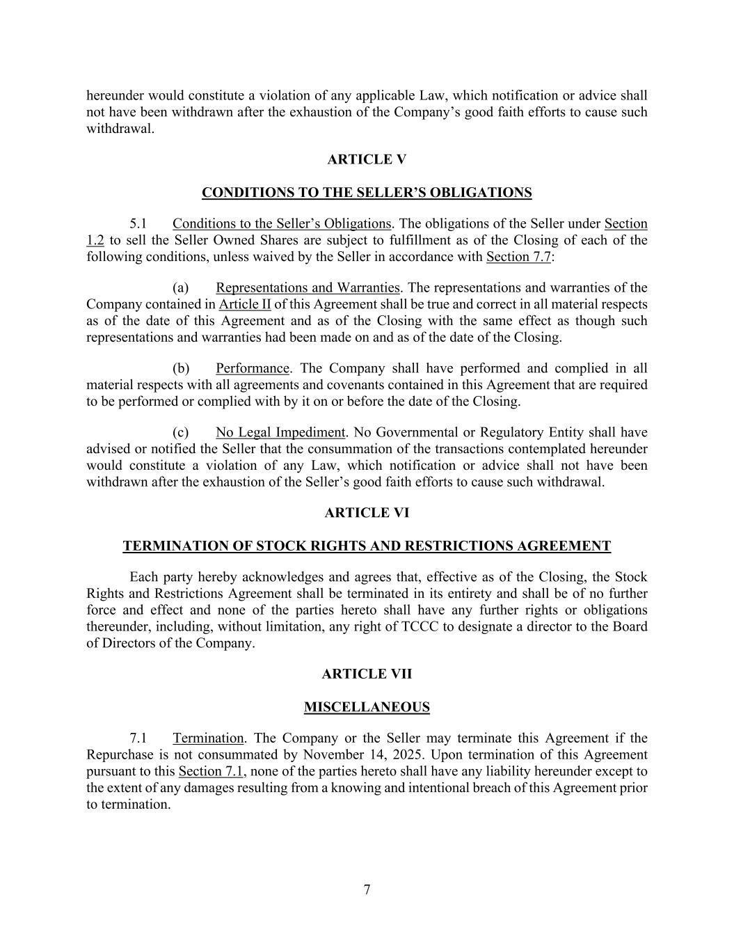 7 hereunder would constitute a violation of any applicable Law, which notification or advice shall not have been withdrawn after the exhaustion of the Company’s good faith efforts to cause such withdrawal. ARTICLE V CONDITIONS TO THE SELLER’S OBLIGATIONS 5.1 Conditions to the Seller’s Obligations. The obligations of the Seller under Section 1.2 to sell the Seller Owned Shares are subject to fulfillment as of the Closing of each of the following conditions, unless waived by the Seller in accordance with Section 7.7: (a) Representations and Warranties. The representations and warranties of the Company contained in Article II of this Agreement shall be true and correct in all material respects as of the date of this Agreement and as of the Closing with the same effect as though such representations and warranties had been made on and as of the date of the Closing. (b) Performance. The Company shall have performed and complied in all material respects with all agreements and covenants contained in this Agreement that are required to be performed or complied with by it on or before the date of the Closing. (c) No Legal Impediment. No Governmental or Regulatory Entity shall have advised or notified the Seller that the consummation of the transactions contemplated hereunder would constitute a violation of any Law, which notification or advice shall not have been withdrawn after the exhaustion of the Seller’s good faith efforts to cause such withdrawal. ARTICLE VI TERMINATION OF STOCK RIGHTS AND RESTRICTIONS AGREEMENT Each party hereby acknowledges and agrees that, effective as of the Closing, the Stock Rights and Restrictions Agreement shall be terminated in its entirety and shall be of no further force and effect and none of the parties hereto shall have any further rights or obligations thereunder, including, without limitation, any right of TCCC to designate a director to the Board of Directors of the Company. ARTICLE VII MISCELLANEOUS 7.1 Termination. The Company or the Seller may terminate this Agreement if the Repurchase is not consummated by November 14, 2025. Upon termination of this Agreement pursuant to this Section 7.1, none of the parties hereto shall have any liability hereunder except to the extent of any damages resulting from a knowing and intentional breach of this Agreement prior to termination.