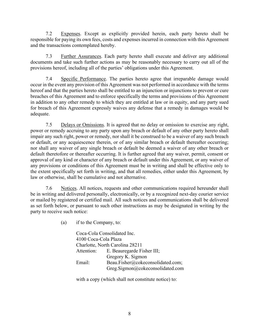 8 7.2 Expenses. Except as explicitly provided herein, each party hereto shall be responsible for paying its own fees, costs and expenses incurred in connection with this Agreement and the transactions contemplated hereby. 7.3 Further Assurances. Each party hereto shall execute and deliver any additional documents and take such further actions as may be reasonably necessary to carry out all of the provisions hereof, including all of the parties’ obligations under this Agreement. 7.4 Specific Performance. The parties hereto agree that irreparable damage would occur in the event any provision of this Agreement was not performed in accordance with the terms hereof and that the parties hereto shall be entitled to an injunction or injunctions to prevent or cure breaches of this Agreement and to enforce specifically the terms and provisions of this Agreement in addition to any other remedy to which they are entitled at law or in equity, and any party sued for breach of this Agreement expressly waives any defense that a remedy in damages would be adequate. 7.5 Delays or Omissions. It is agreed that no delay or omission to exercise any right, power or remedy accruing to any party upon any breach or default of any other party hereto shall impair any such right, power or remedy, nor shall it be construed to be a waiver of any such breach or default, or any acquiescence therein, or of any similar breach or default thereafter occurring; nor shall any waiver of any single breach or default be deemed a waiver of any other breach or default theretofore or thereafter occurring. It is further agreed that any waiver, permit, consent or approval of any kind or character of any breach or default under this Agreement, or any waiver of any provisions or conditions of this Agreement must be in writing and shall be effective only to the extent specifically set forth in writing, and that all remedies, either under this Agreement, by law or otherwise, shall be cumulative and not alternative. 7.6 Notices. All notices, requests and other communications required hereunder shall be in writing and delivered personally, electronically, or by a recognized next-day courier service or mailed by registered or certified mail. All such notices and communications shall be delivered as set forth below, or pursuant to such other instructions as may be designated in writing by the party to receive such notice: (a) if to the Company, to: Coca-Cola Consolidated Inc. 4100 Coca-Cola Plaza Charlotte, North Carolina 28211 Attention: E. Beauregarde Fisher III; Gregory K. Sigmon Email: Beau.Fisher@cokeconsolidated.com; Greg.Sigmon@cokeconsolidated.com with a copy (which shall not constitute notice) to: