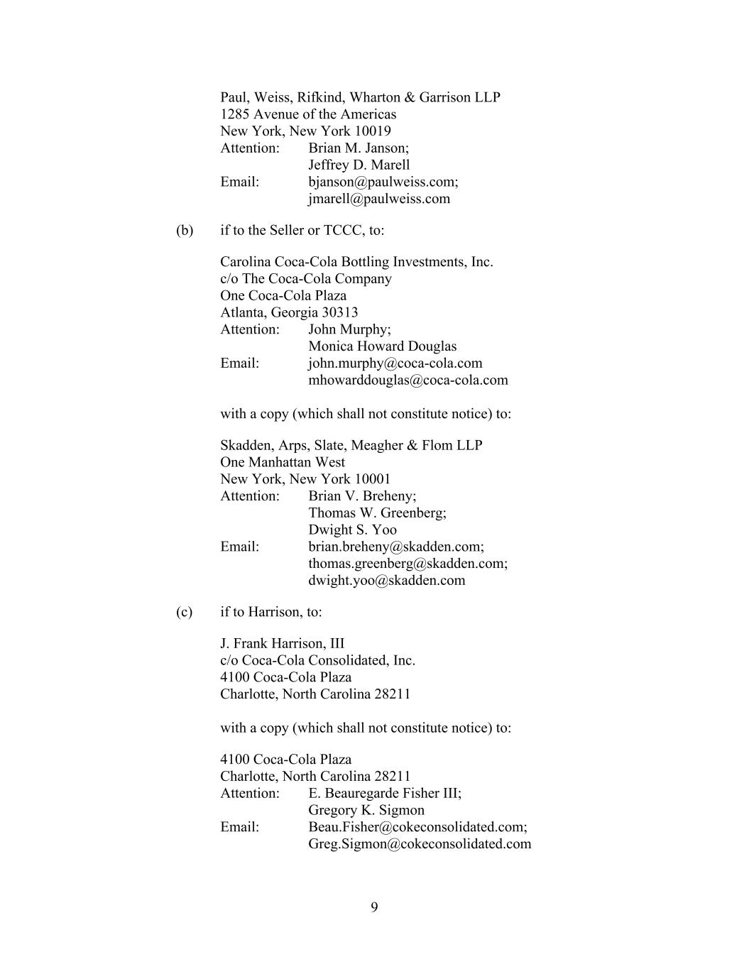 9 Paul, Weiss, Rifkind, Wharton & Garrison LLP 1285 Avenue of the Americas New York, New York 10019 Attention: Brian M. Janson; Jeffrey D. Marell Email: bjanson@paulweiss.com; jmarell@paulweiss.com (b) if to the Seller or TCCC, to: Carolina Coca-Cola Bottling Investments, Inc. c/o The Coca-Cola Company One Coca-Cola Plaza Atlanta, Georgia 30313 Attention: John Murphy; Monica Howard Douglas Email: john.murphy@coca-cola.com mhowarddouglas@coca-cola.com with a copy (which shall not constitute notice) to: Skadden, Arps, Slate, Meagher & Flom LLP One Manhattan West New York, New York 10001 Attention: Brian V. Breheny; Thomas W. Greenberg; Dwight S. Yoo Email: brian.breheny@skadden.com; thomas.greenberg@skadden.com; dwight.yoo@skadden.com (c) if to Harrison, to: J. Frank Harrison, III c/o Coca-Cola Consolidated, Inc. 4100 Coca-Cola Plaza Charlotte, North Carolina 28211 with a copy (which shall not constitute notice) to: 4100 Coca-Cola Plaza Charlotte, North Carolina 28211 Attention: E. Beauregarde Fisher III; Gregory K. Sigmon Email: Beau.Fisher@cokeconsolidated.com; Greg.Sigmon@cokeconsolidated.com