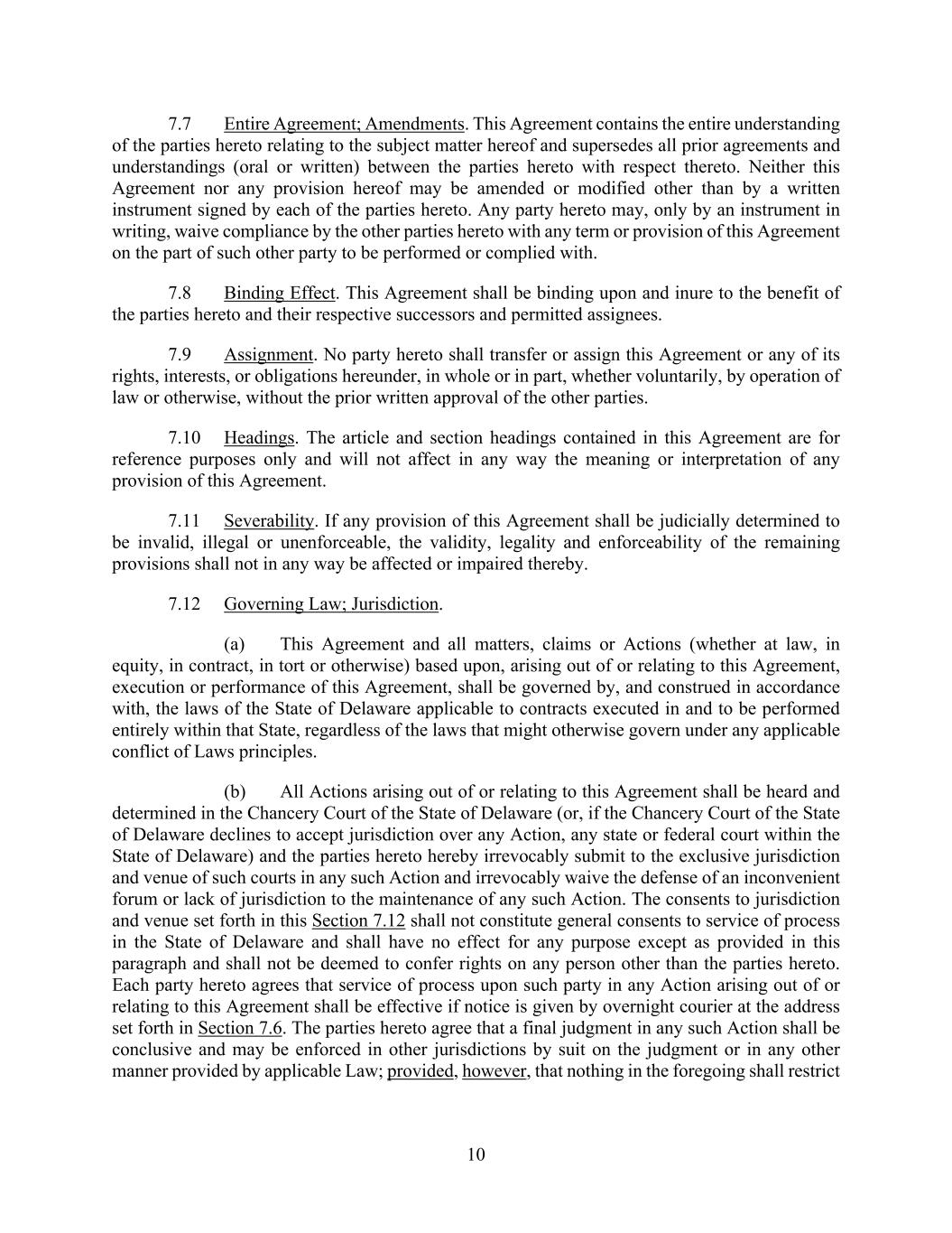 10 7.7 Entire Agreement; Amendments. This Agreement contains the entire understanding of the parties hereto relating to the subject matter hereof and supersedes all prior agreements and understandings (oral or written) between the parties hereto with respect thereto. Neither this Agreement nor any provision hereof may be amended or modified other than by a written instrument signed by each of the parties hereto. Any party hereto may, only by an instrument in writing, waive compliance by the other parties hereto with any term or provision of this Agreement on the part of such other party to be performed or complied with. 7.8 Binding Effect. This Agreement shall be binding upon and inure to the benefit of the parties hereto and their respective successors and permitted assignees. 7.9 Assignment. No party hereto shall transfer or assign this Agreement or any of its rights, interests, or obligations hereunder, in whole or in part, whether voluntarily, by operation of law or otherwise, without the prior written approval of the other parties. 7.10 Headings. The article and section headings contained in this Agreement are for reference purposes only and will not affect in any way the meaning or interpretation of any provision of this Agreement. 7.11 Severability. If any provision of this Agreement shall be judicially determined to be invalid, illegal or unenforceable, the validity, legality and enforceability of the remaining provisions shall not in any way be affected or impaired thereby. 7.12 Governing Law; Jurisdiction. (a) This Agreement and all matters, claims or Actions (whether at law, in equity, in contract, in tort or otherwise) based upon, arising out of or relating to this Agreement, execution or performance of this Agreement, shall be governed by, and construed in accordance with, the laws of the State of Delaware applicable to contracts executed in and to be performed entirely within that State, regardless of the laws that might otherwise govern under any applicable conflict of Laws principles. (b) All Actions arising out of or relating to this Agreement shall be heard and determined in the Chancery Court of the State of Delaware (or, if the Chancery Court of the State of Delaware declines to accept jurisdiction over any Action, any state or federal court within the State of Delaware) and the parties hereto hereby irrevocably submit to the exclusive jurisdiction and venue of such courts in any such Action and irrevocably waive the defense of an inconvenient forum or lack of jurisdiction to the maintenance of any such Action. The consents to jurisdiction and venue set forth in this Section 7.12 shall not constitute general consents to service of process in the State of Delaware and shall have no effect for any purpose except as provided in this paragraph and shall not be deemed to confer rights on any person other than the parties hereto. Each party hereto agrees that service of process upon such party in any Action arising out of or relating to this Agreement shall be effective if notice is given by overnight courier at the address set forth in Section 7.6. The parties hereto agree that a final judgment in any such Action shall be conclusive and may be enforced in other jurisdictions by suit on the judgment or in any other manner provided by applicable Law; provided, however, that nothing in the foregoing shall restrict