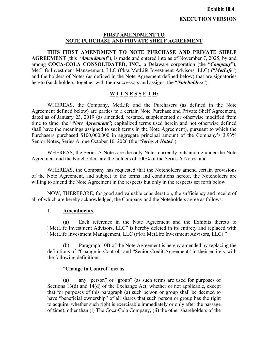 EXECUTION VERSION Exhibit 10.4 FIRST AMENDMENT TO NOTE PURCHASE AND PRIVATE SHELF AGREEMENT THIS FIRST AMENDMENT TO NOTE PURCHASE AND PRIVATE SHELF AGREEMENT (this “Amendment”), is made and entered into as of November 7, 2025, by and among COCA-COLA CONSOLIDATED, INC., a Delaware corporation (the “Company”), MetLife Investment Management, LLC (f/k/a MetLife Investment Advisors, LLC) (“MetLife”) and the holders of Notes (as defined in the Note Agreement defined below) that are signatories hereto (such holders, together with their successors and assigns, the “Noteholders”). W I T N E S S E T H: WHEREAS, the Company, MetLife and the Purchasers (as defined in the Note Agreement defined below) are parties to a certain Note Purchase and Private Shelf Agreement, dated as of January 23, 2019 (as amended, restated, supplemented or otherwise modified from time to time, the “Note Agreement”; capitalized terms used herein and not otherwise defined shall have the meanings assigned to such terms in the Note Agreement), pursuant to which the Purchasers purchased $100,000,000 in aggregate principal amount of the Company’s 3.93% Senior Notes, Series A, due October 10, 2026 (the “Series A Notes”); WHEREAS, the Series A Notes are the only Notes currently outstanding under the Note Agreement and the Noteholders are the holders of 100% of the Series A Notes; and WHEREAS, the Company has requested that the Noteholders amend certain provisions of the Note Agreement, and subject to the terms and conditions hereof, the Noteholders are willing to amend the Note Agreement in the respects but only in the respects set forth below. NOW, THEREFORE, for good and valuable consideration, the sufficiency and receipt of all of which are hereby acknowledged, the Company and the Noteholders agree as follows: 1. Amendments. (a) Each reference in the Note Agreement and the Exhibits thereto to “MetLife Investment Advisors, LLC” is hereby deleted in its entirety and replaced with “MetLife Investment Management, LLC (f/k/a MetLife Investment Advisors, LLC).” (b) Paragraph 10B of the Note Agreement is hereby amended by replacing the definitions of “Change in Control” and “Senior Credit Agreement” in their entirety with the following definitions: “Change in Control” means (a) any “person” or “group” (as such terms are used for purposes of Sections 13(d) and 14(d) of the Exchange Act, whether or not applicable, except that for purposes of this paragraph (a) such person or group shall be deemed to have “beneficial ownership” of all shares that such person or group has the right to acquire, whether such right is exercisable immediately or only after the passage of time), other than (i) The Coca-Cola Company, (ii) the other shareholders of the