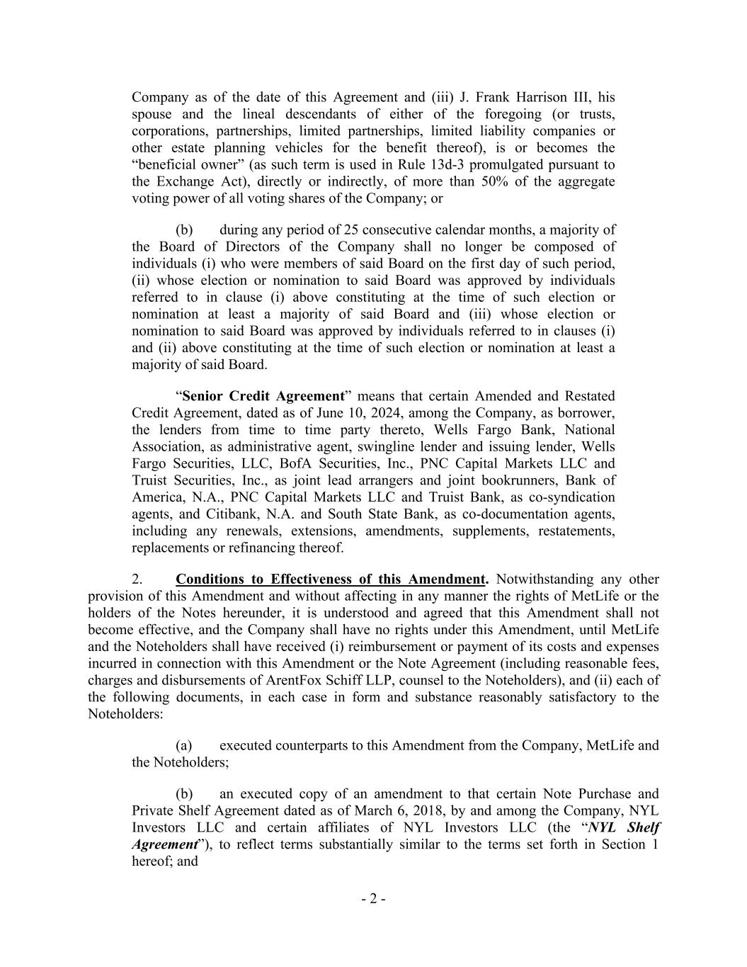 - 2 - Company as of the date of this Agreement and (iii) J. Frank Harrison III, his spouse and the lineal descendants of either of the foregoing (or trusts, corporations, partnerships, limited partnerships, limited liability companies or other estate planning vehicles for the benefit thereof), is or becomes the “beneficial owner” (as such term is used in Rule 13d-3 promulgated pursuant to the Exchange Act), directly or indirectly, of more than 50% of the aggregate voting power of all voting shares of the Company; or (b) during any period of 25 consecutive calendar months, a majority of the Board of Directors of the Company shall no longer be composed of individuals (i) who were members of said Board on the first day of such period, (ii) whose election or nomination to said Board was approved by individuals referred to in clause (i) above constituting at the time of such election or nomination at least a majority of said Board and (iii) whose election or nomination to said Board was approved by individuals referred to in clauses (i) and (ii) above constituting at the time of such election or nomination at least a majority of said Board. “Senior Credit Agreement” means that certain Amended and Restated Credit Agreement, dated as of June 10, 2024, among the Company, as borrower, the lenders from time to time party thereto, Wells Fargo Bank, National Association, as administrative agent, swingline lender and issuing lender, Wells Fargo Securities, LLC, BofA Securities, Inc., PNC Capital Markets LLC and Truist Securities, Inc., as joint lead arrangers and joint bookrunners, Bank of America, N.A., PNC Capital Markets LLC and Truist Bank, as co-syndication agents, and Citibank, N.A. and South State Bank, as co-documentation agents, including any renewals, extensions, amendments, supplements, restatements, replacements or refinancing thereof. 2. Conditions to Effectiveness of this Amendment. Notwithstanding any other provision of this Amendment and without affecting in any manner the rights of MetLife or the holders of the Notes hereunder, it is understood and agreed that this Amendment shall not become effective, and the Company shall have no rights under this Amendment, until MetLife and the Noteholders shall have received (i) reimbursement or payment of its costs and expenses incurred in connection with this Amendment or the Note Agreement (including reasonable fees, charges and disbursements of ArentFox Schiff LLP, counsel to the Noteholders), and (ii) each of the following documents, in each case in form and substance reasonably satisfactory to the Noteholders: (a) executed counterparts to this Amendment from the Company, MetLife and the Noteholders; (b) an executed copy of an amendment to that certain Note Purchase and Private Shelf Agreement dated as of March 6, 2018, by and among the Company, NYL Investors LLC and certain affiliates of NYL Investors LLC (the “NYL Shelf Agreement”), to reflect terms substantially similar to the terms set forth in Section 1 hereof; and