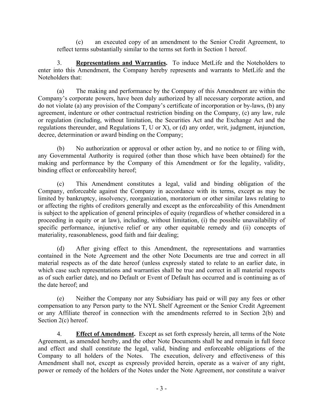 - 3 - (c) an executed copy of an amendment to the Senior Credit Agreement, to reflect terms substantially similar to the terms set forth in Section 1 hereof. 3. Representations and Warranties. To induce MetLife and the Noteholders to enter into this Amendment, the Company hereby represents and warrants to MetLife and the Noteholders that: (a) The making and performance by the Company of this Amendment are within the Company’s corporate powers, have been duly authorized by all necessary corporate action, and do not violate (a) any provision of the Company’s certificate of incorporation or by-laws, (b) any agreement, indenture or other contractual restriction binding on the Company, (c) any law, rule or regulation (including, without limitation, the Securities Act and the Exchange Act and the regulations thereunder, and Regulations T, U or X), or (d) any order, writ, judgment, injunction, decree, determination or award binding on the Company; (b) No authorization or approval or other action by, and no notice to or filing with, any Governmental Authority is required (other than those which have been obtained) for the making and performance by the Company of this Amendment or for the legality, validity, binding effect or enforceability hereof; (c) This Amendment constitutes a legal, valid and binding obligation of the Company, enforceable against the Company in accordance with its terms, except as may be limited by bankruptcy, insolvency, reorganization, moratorium or other similar laws relating to or affecting the rights of creditors generally and except as the enforceability of this Amendment is subject to the application of general principles of equity (regardless of whether considered in a proceeding in equity or at law), including, without limitation, (i) the possible unavailability of specific performance, injunctive relief or any other equitable remedy and (ii) concepts of materiality, reasonableness, good faith and fair dealing; (d) After giving effect to this Amendment, the representations and warranties contained in the Note Agreement and the other Note Documents are true and correct in all material respects as of the date hereof (unless expressly stated to relate to an earlier date, in which case such representations and warranties shall be true and correct in all material respects as of such earlier date), and no Default or Event of Default has occurred and is continuing as of the date hereof; and (e) Neither the Company nor any Subsidiary has paid or will pay any fees or other compensation to any Person party to the NYL Shelf Agreement or the Senior Credit Agreement or any Affiliate thereof in connection with the amendments referred to in Section 2(b) and Section 2(c) hereof. 4. Effect of Amendment. Except as set forth expressly herein, all terms of the Note Agreement, as amended hereby, and the other Note Documents shall be and remain in full force and effect and shall constitute the legal, valid, binding and enforceable obligations of the Company to all holders of the Notes. The execution, delivery and effectiveness of this Amendment shall not, except as expressly provided herein, operate as a waiver of any right, power or remedy of the holders of the Notes under the Note Agreement, nor constitute a waiver