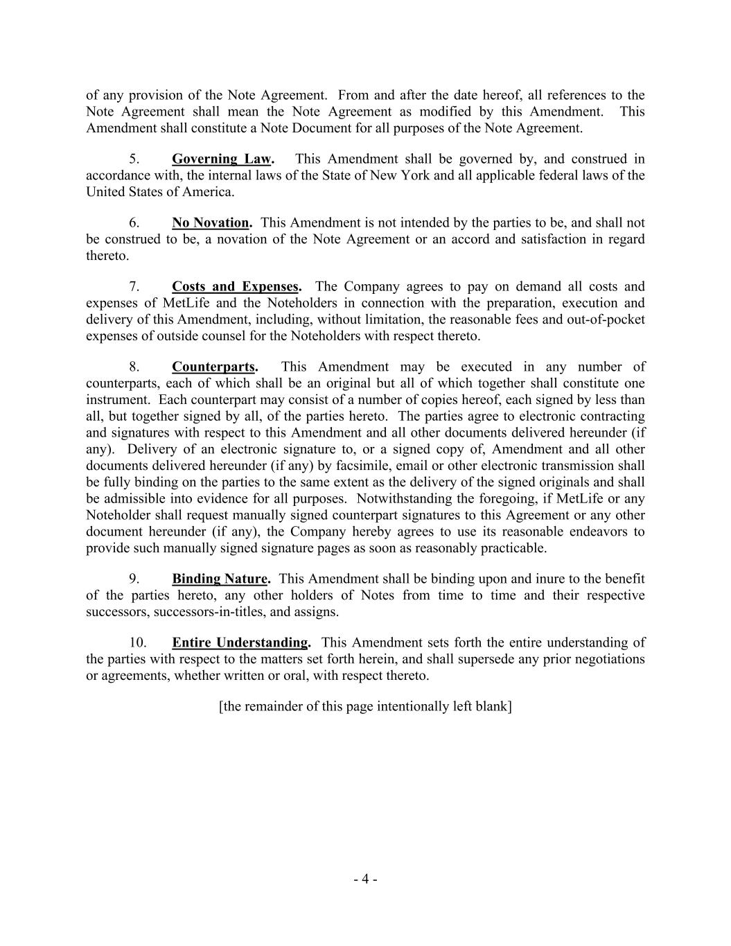- 4 - of any provision of the Note Agreement. From and after the date hereof, all references to the Note Agreement shall mean the Note Agreement as modified by this Amendment. This Amendment shall constitute a Note Document for all purposes of the Note Agreement. 5. Governing Law. This Amendment shall be governed by, and construed in accordance with, the internal laws of the State of New York and all applicable federal laws of the United States of America. 6. No Novation. This Amendment is not intended by the parties to be, and shall not be construed to be, a novation of the Note Agreement or an accord and satisfaction in regard thereto. 7. Costs and Expenses. The Company agrees to pay on demand all costs and expenses of MetLife and the Noteholders in connection with the preparation, execution and delivery of this Amendment, including, without limitation, the reasonable fees and out-of-pocket expenses of outside counsel for the Noteholders with respect thereto. 8. Counterparts. This Amendment may be executed in any number of counterparts, each of which shall be an original but all of which together shall constitute one instrument. Each counterpart may consist of a number of copies hereof, each signed by less than all, but together signed by all, of the parties hereto. The parties agree to electronic contracting and signatures with respect to this Amendment and all other documents delivered hereunder (if any). Delivery of an electronic signature to, or a signed copy of, Amendment and all other documents delivered hereunder (if any) by facsimile, email or other electronic transmission shall be fully binding on the parties to the same extent as the delivery of the signed originals and shall be admissible into evidence for all purposes. Notwithstanding the foregoing, if MetLife or any Noteholder shall request manually signed counterpart signatures to this Agreement or any other document hereunder (if any), the Company hereby agrees to use its reasonable endeavors to provide such manually signed signature pages as soon as reasonably practicable. 9. Binding Nature. This Amendment shall be binding upon and inure to the benefit of the parties hereto, any other holders of Notes from time to time and their respective successors, successors-in-titles, and assigns. 10. Entire Understanding. This Amendment sets forth the entire understanding of the parties with respect to the matters set forth herein, and shall supersede any prior negotiations or agreements, whether written or oral, with respect thereto. [the remainder of this page intentionally left blank]
