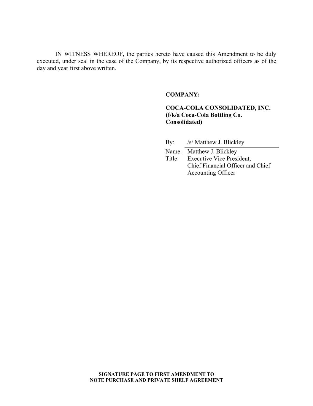 SIGNATURE PAGE TO FIRST AMENDMENT TO NOTE PURCHASE AND PRIVATE SHELF AGREEMENT IN WITNESS WHEREOF, the parties hereto have caused this Amendment to be duly executed, under seal in the case of the Company, by its respective authorized officers as of the day and year first above written. COMPANY: COCA-COLA CONSOLIDATED, INC. (f/k/a Coca-Cola Bottling Co. Consolidated) By: /s/ Matthew J. Blickley Name: Matthew J. Blickley Title: Executive Vice President, Chief Financial Officer and Chief Accounting Officer