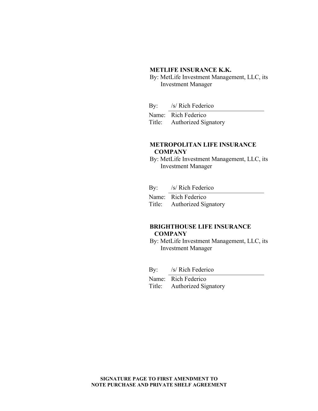 SIGNATURE PAGE TO FIRST AMENDMENT TO NOTE PURCHASE AND PRIVATE SHELF AGREEMENT METLIFE INSURANCE K.K. By: MetLife Investment Management, LLC, its Investment Manager By: /s/ Rich Federico Name: Rich Federico Title: Authorized Signatory METROPOLITAN LIFE INSURANCE COMPANY By: MetLife Investment Management, LLC, its Investment Manager By: /s/ Rich Federico Name: Rich Federico Title: Authorized Signatory BRIGHTHOUSE LIFE INSURANCE COMPANY By: MetLife Investment Management, LLC, its Investment Manager By: /s/ Rich Federico Name: Rich Federico Title: Authorized Signatory
