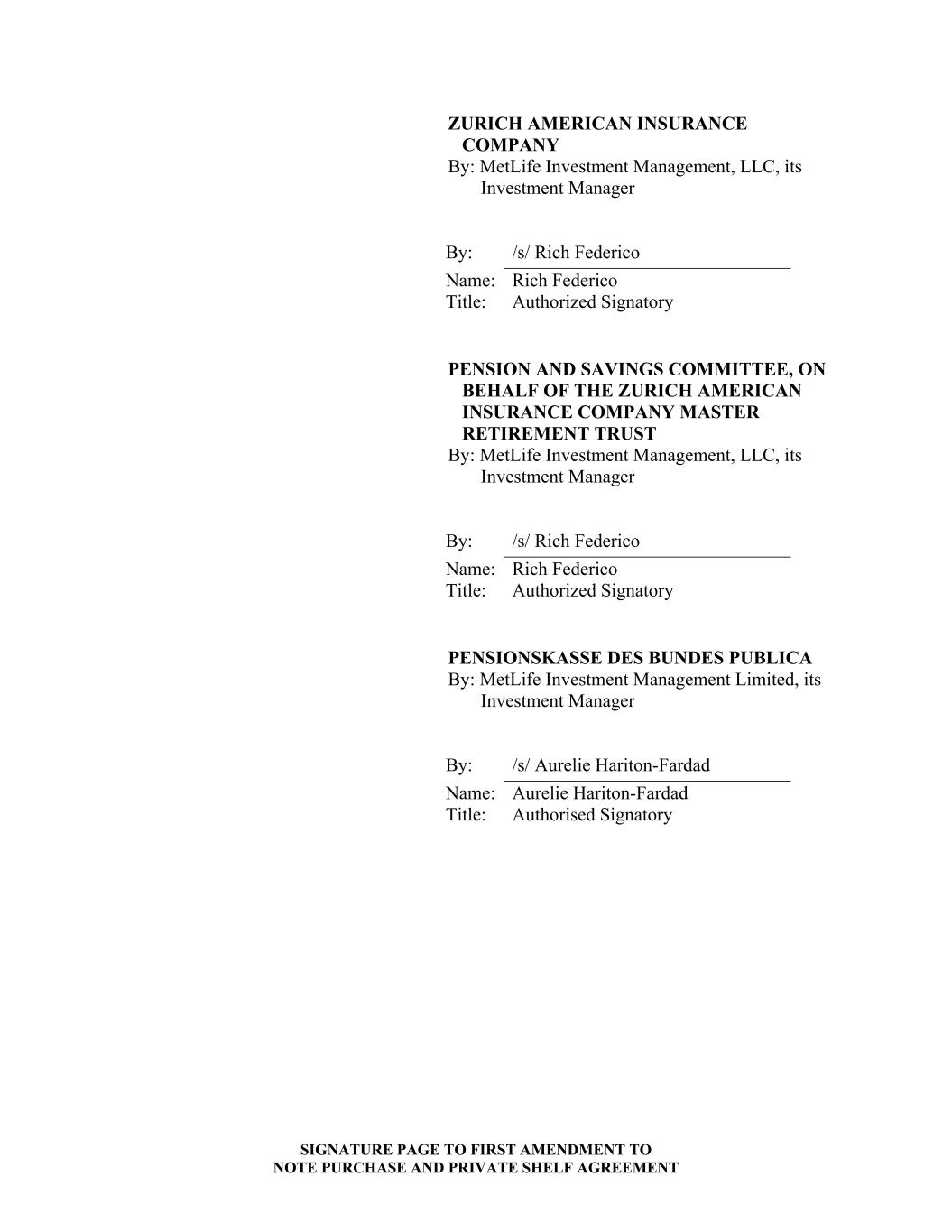 SIGNATURE PAGE TO FIRST AMENDMENT TO NOTE PURCHASE AND PRIVATE SHELF AGREEMENT ZURICH AMERICAN INSURANCE COMPANY By: MetLife Investment Management, LLC, its Investment Manager By: /s/ Rich Federico Name: Rich Federico Title: Authorized Signatory PENSION AND SAVINGS COMMITTEE, ON BEHALF OF THE ZURICH AMERICAN INSURANCE COMPANY MASTER RETIREMENT TRUST By: MetLife Investment Management, LLC, its Investment Manager By: /s/ Rich Federico Name: Rich Federico Title: Authorized Signatory PENSIONSKASSE DES BUNDES PUBLICA By: MetLife Investment Management Limited, its Investment Manager By: /s/ Aurelie Hariton-Fardad Name: Aurelie Hariton-Fardad Title: Authorised Signatory