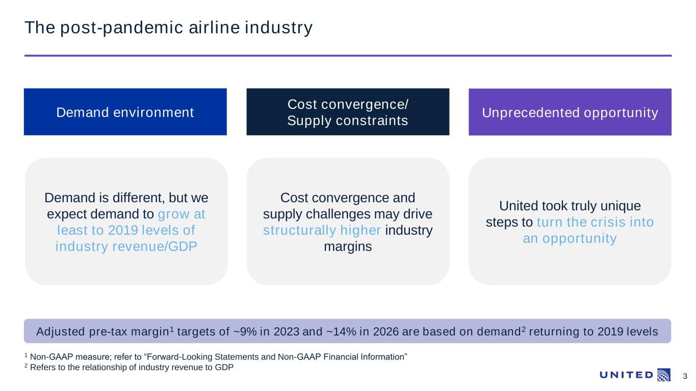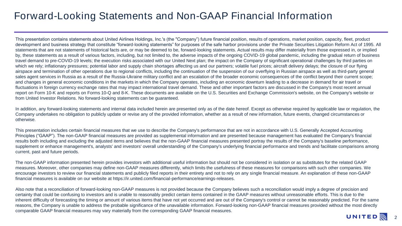 2 Forward-Looking Statements and Non-GAAP Financial Information This presentation contains statements about United Airlines Holdings, Inc.'s (the "Company”) future financial position, results of operations, market position, capacity, fleet, product development and business strategy that constitute “forward-looking statements” for purposes of the safe harbor provisions under the Private Securities Litigation Reform Act of 1995. All statements that are not statements of historical facts are, or may be deemed to be, forward-looking statements. Actual results may differ materially from those expressed in, or implied by, these statements as a result of various factors, including, but not limited to, the adverse impacts of the ongoing COVID-19 global pandemic, including the gradual return of business travel demand to pre-COVID-19 levels; the execution risks associated with our United Next plan; the impact on the Company of significant operational challenges by third parties on which we rely; inflationary pressures; potential labor and supply chain shortages affecting us and our partners; volatile fuel prices; aircraft delivery delays; the closure of our flying airspace and termination of other operations due to regional conflicts, including the continuation of the suspension of our overflying in Russian airspace as well as third-party general sales agent services in Russia as a result of the Russia-Ukraine military conflict and an escalation of the broader economic consequences of the conflict beyond their current scope; and changes in general economic conditions in the markets in which the Company operates, including an economic downturn leading to a decrease in demand for air travel or fluctuations in foreign currency exchange rates that may impact international travel demand. These and other important factors are discussed in the Company's most recent annual report on Form 10-K and reports on Forms 10-Q and 8-K. These documents are available on the U.S. Securities and Exchange Commission's website, on the Company's website or from United Investor Relations. No forward-looking statements can be guaranteed. In addition, any forward-looking statements and internal data included herein are presented only as of the date hereof. Except as otherwise required by applicable law or regulation, the Company undertakes no obligation to publicly update or revise any of the provided information, whether as a result of new information, future events, changed circumstances or otherwise. This presentation includes certain financial measures that we use to describe the Company's performance that are not in accordance with U.S. Generally Accepted Accounting Principles (“GAAP”). The non-GAAP financial measures are provided as supplemental information and are presented because management has evaluated the Company's financial results both including and excluding the adjusted items and believes that the non-GAAP financial measures presented portray the results of the Company's baseline performance, supplement or enhance management's, analysts' and investors' overall understanding of the Company's underlying financial performance and trends and facilitate comparisons among current, past and future periods. The non-GAAP information presented herein provides investors with additional useful information but should not be considered in isolation or as substitutes for the related GAAP measures. Moreover, other companies may define non-GAAP measures differently, which limits the usefulness of these measures for comparisons with such other companies. We encourage investors to review our financial statements and publicly filed reports in their entirety and not to rely on any single financial measure. An explanation of these non-GAAP financial measures is available on our website at https://ir.united.com/financial-performance/earnings-releases. Also note that a reconciliation of forward-looking non-GAAP measures is not provided because the Company believes such a reconciliation would imply a degree of precision and certainty that could be confusing to investors and is unable to reasonably predict certain items contained in the GAAP measures without unreasonable efforts. This is due to the inherent difficulty of forecasting the timing or amount of various items that have not yet occurred and are out of the Company's control or cannot be reasonably predicted. For the same reasons, the Company is unable to address the probable significance of the unavailable information. Forward-looking non-GAAP financial measures provided without the most directly comparable GAAP financial measures may vary materially from the corresponding GAAP financial measures.