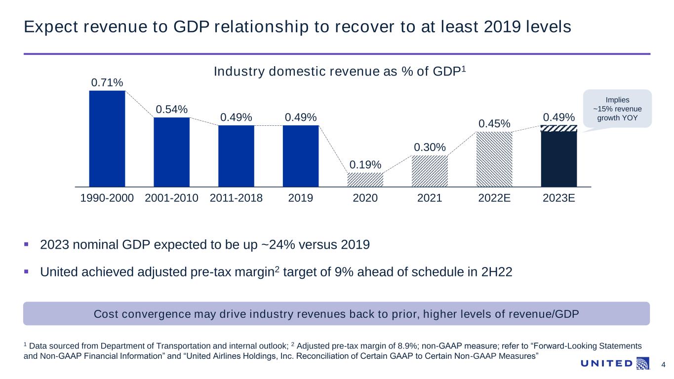 3 The post-pandemic airline industry United took truly unique steps to turn the crisis into an opportunity Demand is different, but we expect demand to grow at least to 2019 levels of industry revenue/GDP Cost convergence and supply challenges may drive structurally higher industry margins Unprecedented opportunityDemand environment Cost convergence/ Supply constraints Adjusted pre-tax margin1 targets of ~9% in 2023 and ~14% in 2026 are based on demand2 returning to 2019 levels 1 Non-GAAP measure; refer to “Forward-Looking Statements and Non-GAAP Financial Information” 2 Refers to the relationship of industry revenue to GDP