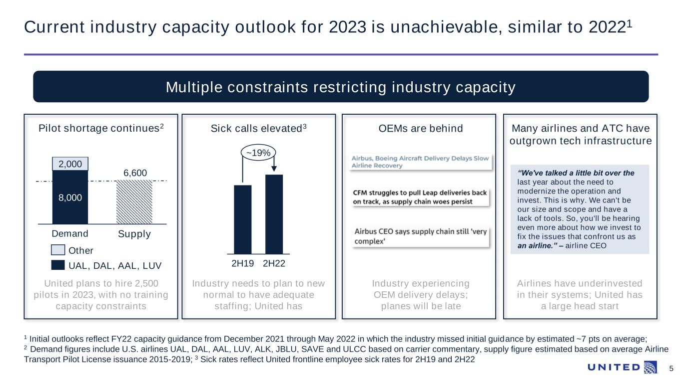 4 Expect revenue to GDP relationship to recover to at least 2019 levels ▪ 2023 nominal GDP expected to be up ~24% versus 2019 ▪ United achieved adjusted pre-tax margin2 target of 9% ahead of schedule in 2H22 2022E2021 0.54% 202020192001-2010 2011-20181990-2000 0.30% 0.45% 0.49% 0.19% 2023E 0.71% 0.49% 0.49% Industry domestic revenue as % of GDP1 1 Data sourced from Department of Transportation and internal outlook; 2 Adjusted pre-tax margin of 8.9%; non-GAAP measure; refer to “Forward-Looking Statements and Non-GAAP Financial Information” and “United Airlines Holdings, Inc. Reconciliation of Certain GAAP to Certain Non-GAAP Measures” Implies ~15% revenue growth YOY Cost convergence may drive industry revenues back to prior, higher levels of revenue/GDP