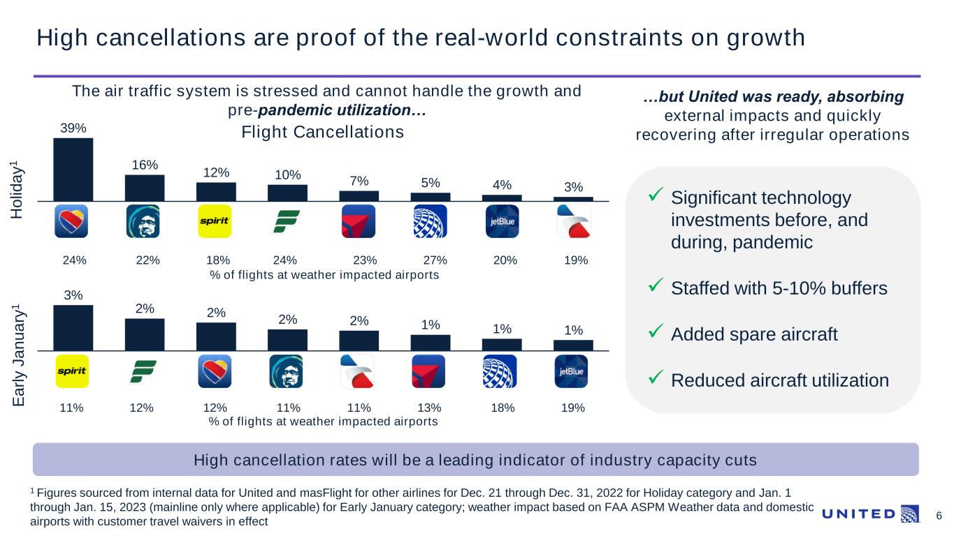 5 8,000 2,000 SupplyDemand Current industry capacity outlook for 2023 is unachievable, similar to 20221 1 Initial outlooks reflect FY22 capacity guidance from December 2021 through May 2022 in which the industry missed initial guidance by estimated ~7 pts on average; 2 Demand figures include U.S. airlines UAL, DAL, AAL, LUV, ALK, JBLU, SAVE and ULCC based on carrier commentary, supply figure estimated based on average Airline Transport Pilot License issuance 2015-2019; 3 Sick rates reflect United frontline employee sick rates for 2H19 and 2H22 United plans to hire 2,500 pilots in 2023, with no training capacity constraints Pilot shortage continues2 Sick calls elevated3 Industry needs to plan to new normal to have adequate staffing; United has Industry experiencing OEM delivery delays; planes will be late 6,600 Other UAL, DAL, AAL, LUV OEMs are behind Multiple constraints restricting industry capacity Many airlines and ATC have outgrown tech infrastructure Airlines have underinvested in their systems; United has a large head start “We've talked a little bit over the last year about the need to modernize the operation and invest. This is why. We can't be our size and scope and have a lack of tools. So, you'll be hearing even more about how we invest to fix the issues that confront us as an airline.” – airline CEO 2H19 2H22 ~19%