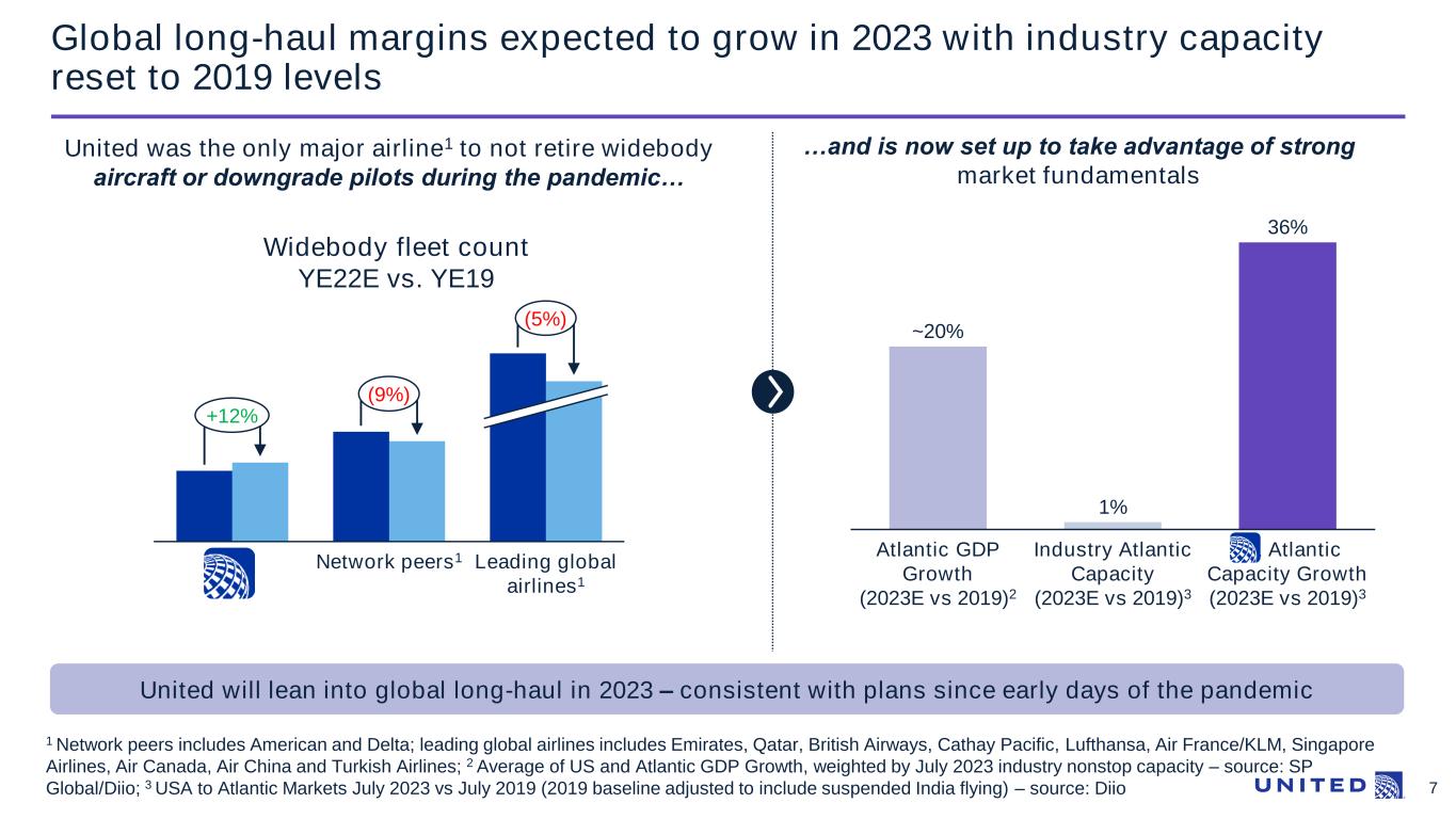 6 High cancellations are proof of the real-world constraints on growth 1 Figures sourced from internal data for United and masFlight for other airlines for Dec. 21 through Dec. 31, 2022 for Holiday category and Jan. 1 through Jan. 15, 2023 (mainline only where applicable) for Early January category; weather impact based on FAA ASPM Weather data and domestic airports with customer travel waivers in effect ASWN AANK F9 DL B6UA 39% 16% 12% 10% 7% 5% 4% 3% H o lid a y 1 NK F9 ASWN UA 2% 2% 3% 2% 2% 1% B6 1% DL 1% AA E a rl y J a n u a ry 1 % of flights at weather impacted airports 24% 22% 18% 24% 23% 27% 20% 19% % of flights at weather impacted airports 11% 12% 12% 11% 11% 13% 18% 19% The air traffic system is stressed and cannot handle the growth and pre-pandemic utilization… High cancellation rates will be a leading indicator of industry capacity cuts …but United was ready, absorbing external impacts and quickly recovering after irregular operations ✓ Significant technology investments before, and during, pandemic ✓ Staffed with 5-10% buffers ✓ Added spare aircraft ✓ Reduced aircraft utilization Flight Cancellations