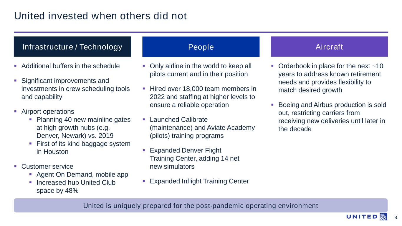 7 Global long-haul margins expected to grow in 2023 with industry capacity reset to 2019 levels Network peers1UA Leading global airlines1 +12% (9%) (5%) Widebody fleet count YE22E vs. YE19 United will lean into global long-haul in 2023 – consistent with plans since early days of the pandemic ~20% Atlantic GDP Growth (2023E vs 2019)2 UA Atlantic Capacity Growth (2023E vs 2019)3 Industry Atlantic Capacity (2023E vs 2019)3 1% 36% 1 Network peers includes American and Delta; leading global airlines includes Emirates, Qatar, British Airways, Cathay Pacific, Lufthansa, Air France/KLM, Singapore Airlines, Air Canada, Air China and Turkish Airlines; 2 Average of US and Atlantic GDP Growth, weighted by July 2023 industry nonstop capacity – source: SP Global/Diio; 3 USA to Atlantic Markets July 2023 vs July 2019 (2019 baseline adjusted to include suspended India flying) – source: Diio United was the only major airline1 to not retire widebody aircraft or downgrade pilots during the pandemic… …and is now set up to take advantage of strong market fundamentals