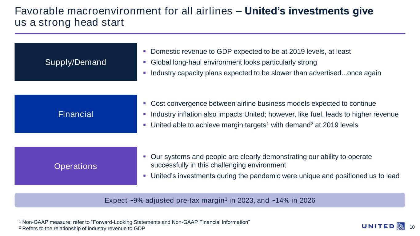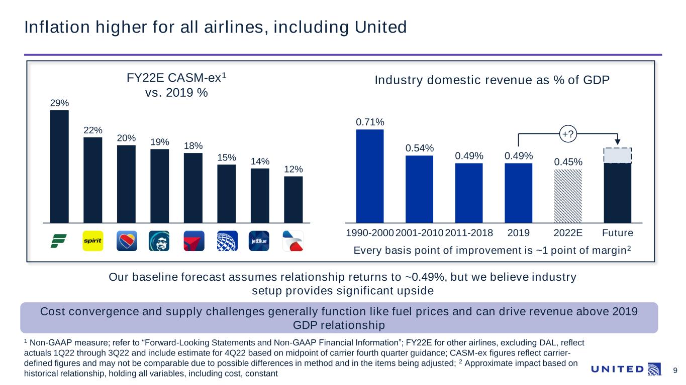 9 Inflation higher for all airlines, including United 1 Non-GAAP measure; refer to “Forward-Looking Statements and Non-GAAP Financial Information”; FY22E for other airlines, excluding DAL, reflect actuals 1Q22 through 3Q22 and include estimate for 4Q22 based on midpoint of carrier fourth quarter guidance; CASM-ex figures reflect carrier- defined figures and may not be comparable due to possible differences in method and in the items being adjusted; 2 Approximate impact based on historical relationship, holding all variables, including cost, constant FY22E CASM-ex1 vs. 2019 % 29% 12% 20% 19% 22% 14%15% 18% Cost convergence and supply challenges generally function like fuel prices and can drive revenue above 2019 GDP relationship Future1990-2000 0.54% 2001-2010 20192011-2018 2022E 0.71% 0.49% 0.49% 0.45% +? Industry domestic revenue as % of GDP Our baseline forecast assumes relationship returns to ~0.49%, but we believe industry setup provides significant upside Every basis point of improvement is ~1 point of margin2