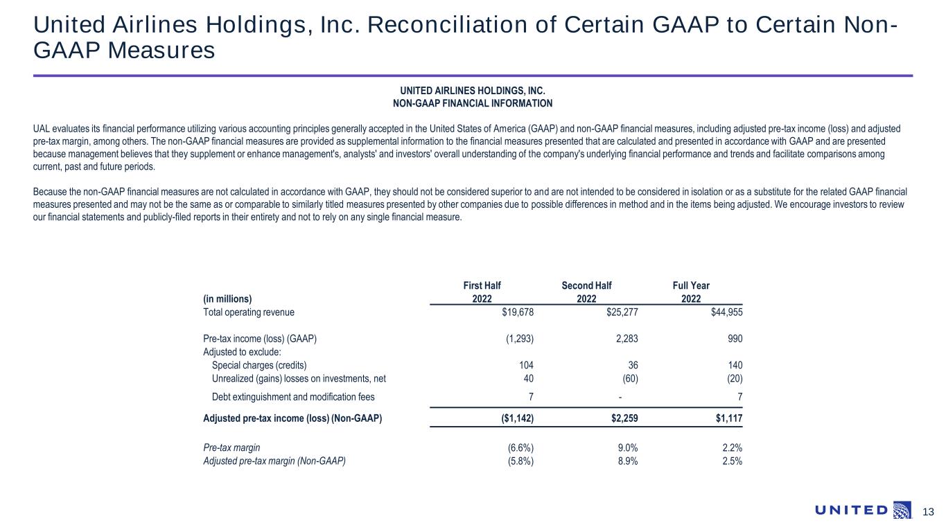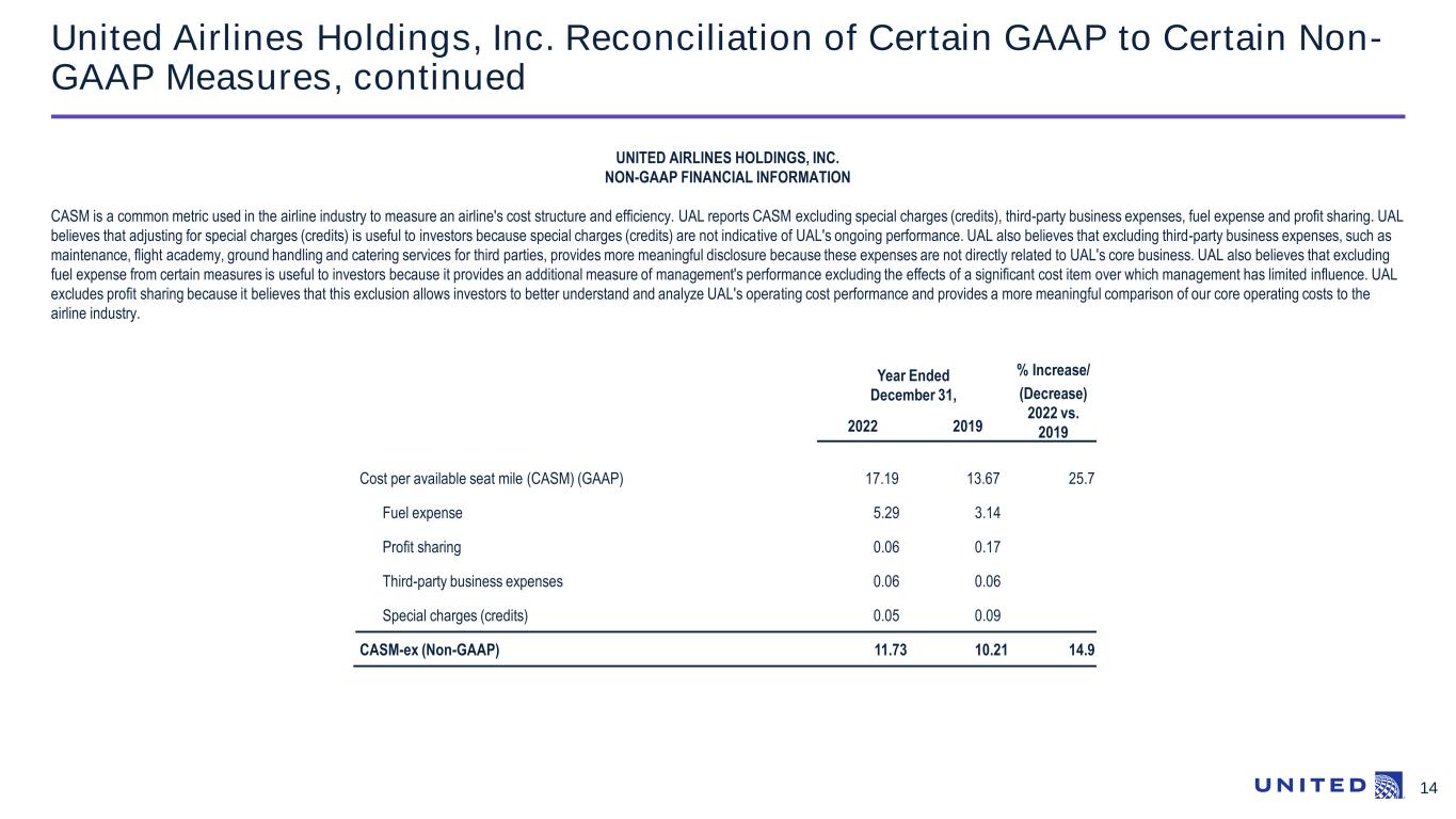 13 United Airlines Holdings, Inc. Reconciliation of Certain GAAP to Certain Non- GAAP Measures First Half Second Half Full Year (in millions) 2022 2022 2022 Total operating revenue $19,678 $25,277 $44,955 Pre-tax income (loss) (GAAP) (1,293) 2,283 990 Adjusted to exclude: Special charges (credits) 104 36 140 Unrealized (gains) losses on investments, net 40 (60) (20) Debt extinguishment and modification fees 7 - 7 Adjusted pre-tax income (loss) (Non-GAAP) ($1,142) $2,259 $1,117 Pre-tax margin (6.6%) 9.0% 2.2% Adjusted pre-tax margin (Non-GAAP) (5.8%) 8.9% 2.5% UNITED AIRLINES HOLDINGS, INC. NON-GAAP FINANCIAL INFORMATION UAL evaluates its financial performance utilizing various accounting principles generally accepted in the United States of America (GAAP) and non-GAAP financial measures, including adjusted pre-tax income (loss) and adjusted pre-tax margin, among others. The non-GAAP financial measures are provided as supplemental information to the financial measures presented that are calculated and presented in accordance with GAAP and are presented because management believes that they supplement or enhance management's, analysts' and investors' overall understanding of the company's underlying financial performance and trends and facilitate comparisons among current, past and future periods. Because the non-GAAP financial measures are not calculated in accordance with GAAP, they should not be considered superior to and are not intended to be considered in isolation or as a substitute for the related GAAP financial measures presented and may not be the same as or comparable to similarly titled measures presented by other companies due to possible differences in method and in the items being adjusted. We encourage investors to review our financial statements and publicly-filed reports in their entirety and not to rely on any single financial measure.