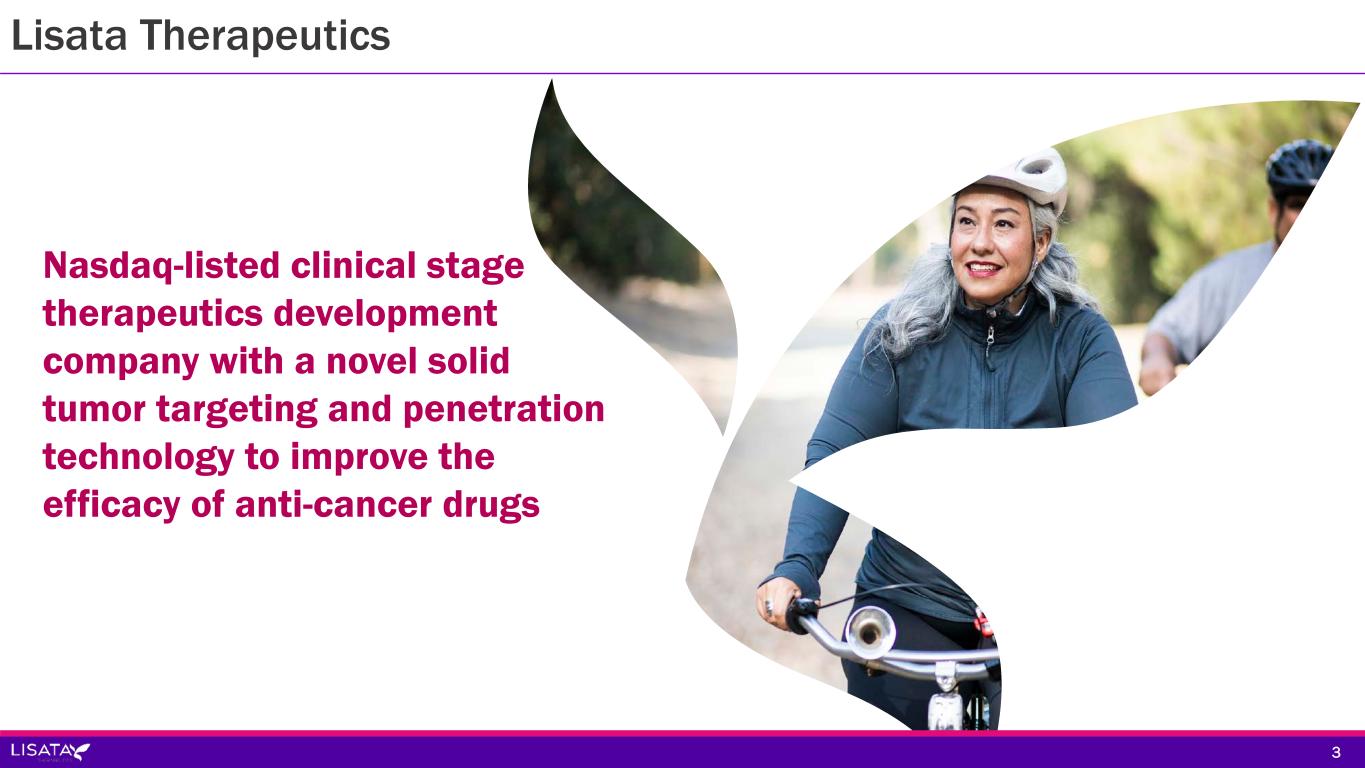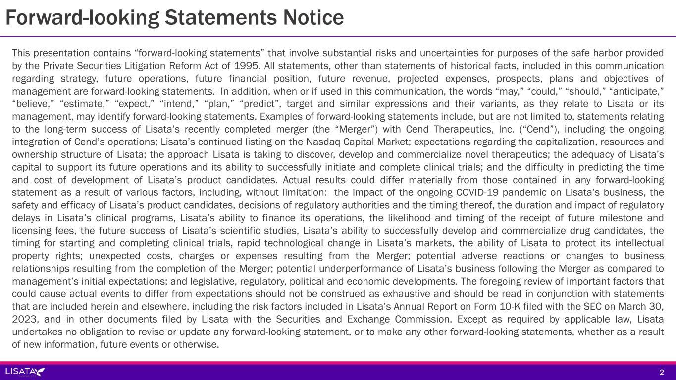 Forward-looking Statements Notice This presentation contains “forward-looking statements” that involve substantial risks and uncertainties for purposes of the safe harbor provided by the Private Securities Litigation Reform Act of 1995. All statements, other than statements of historical facts, included in this communication regarding strategy, future operations, future financial position, future revenue, projected expenses, prospects, plans and objectives of management are forward-looking statements. In addition, when or if used in this communication, the words “may,” “could,” “should,” “anticipate,” “believe,” “estimate,” “expect,” “intend,” “plan,” “predict”, target and similar expressions and their variants, as they relate to Lisata or its management, may identify forward-looking statements. Examples of forward-looking statements include, but are not limited to, statements relating to the long-term success of Lisata’s recently completed merger (the “Merger”) with Cend Therapeutics, Inc. (“Cend”), including the ongoing integration of Cend’s operations; Lisata’s continued listing on the Nasdaq Capital Market; expectations regarding the capitalization, resources and ownership structure of Lisata; the approach Lisata is taking to discover, develop and commercialize novel therapeutics; the adequacy of Lisata’s capital to support its future operations and its ability to successfully initiate and complete clinical trials; and the difficulty in predicting the time and cost of development of Lisata’s product candidates. Actual results could differ materially from those contained in any forward-looking statement as a result of various factors, including, without limitation: the impact of the ongoing COVID-19 pandemic on Lisata’s business, the safety and efficacy of Lisata’s product candidates, decisions of regulatory authorities and the timing thereof, the duration and impact of regulatory delays in Lisata’s clinical programs, Lisata’s ability to finance its operations, the likelihood and timing of the receipt of future milestone and licensing fees, the future success of Lisata’s scientific studies, Lisata’s ability to successfully develop and commercialize drug candidates, the timing for starting and completing clinical trials, rapid technological change in Lisata’s markets, the ability of Lisata to protect its intellectual property rights; unexpected costs, charges or expenses resulting from the Merger; potential adverse reactions or changes to business relationships resulting from the completion of the Merger; potential underperformance of Lisata’s business following the Merger as compared to management’s initial expectations; and legislative, regulatory, political and economic developments. The foregoing review of important factors that could cause actual events to differ from expectations should not be construed as exhaustive and should be read in conjunction with statements that are included herein and elsewhere, including the risk factors included in Lisata’s Annual Report on Form 10-K filed with the SEC on March 30, 2023, and in other documents filed by Lisata with the Securities and Exchange Commission. Except as required by applicable law, Lisata undertakes no obligation to revise or update any forward-looking statement, or to make any other forward-looking statements, whether as a result of new information, future events or otherwise. 2