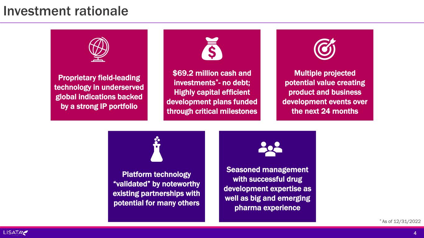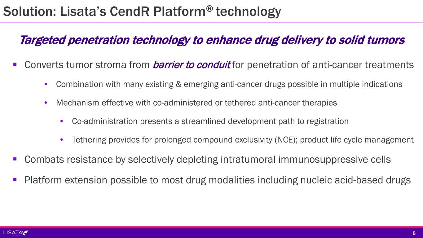LISATA EUTICSTHERAP Nasdaq-listed clinical stage therapeutics development company with a novel solid tumor targeting and penetration technology to improve the efficacy of anti-cancer drugs 3 Lisata Therapeutics
