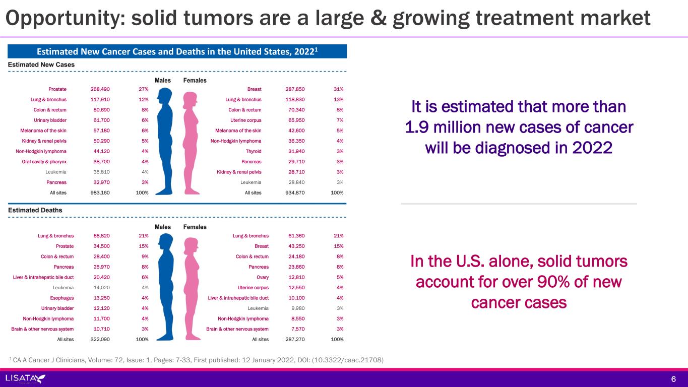Opportunity: solid tumors are a large & growing treatment market 1 CA A Cancer J Clinicians, Volume: 72, Issue: 1, Pages: 7-33, First published: 12 January 2022, DOI: (10.3322/caac.21708) 6 It is estimated that more than 1.9 million new cases of cancer will be diagnosed in 2022 In the U.S. alone, solid tumors account for over 90% of new cancer cases Estimated New Cancer Cases and Deaths in the United States, 20221 Prostate 268,490 27% Lung & bronchus 117,910 12% Colon & rectum 80,690 8% Urinary bladder 61,700 6% Melanoma of the skin 57,180 6% Kidney & renal pelvis 50,290 5% Non-Hodgkin lymphoma 44,120 4% Oral cavity & pharynx 38,700 4% Leukemia 35,810 4% Pancreas 32,970 3% All sites 983,160 100% Breast 287,850 31% Lung & bronchus 118,830 13% Colon & rectum 70,340 8% Uterine corpus 65,950 7% Melanoma of the skin 42,600 5% Non-Hodgkin lymphoma 36,350 4% Thyroid 31,940 3% Pancreas 29,710 3% Kidney & renal pelvis 28,710 3% Leukemia 28,840 3% All sites 934,870 100% Lung & bronchus 68,820 21% Prostate 34,500 15% Colon & rectum 28,400 9% Pancreas 25,970 8% Liver & intrahepatic bile duct 20,420 6% Leukemia 14,020 4% Esophagus 13,250 4% Urinary bladder 12,120 4% Non-Hodgkin lymphoma 11,700 4% Brain & other nervous system 10,710 3% All sites 322,090 100% Lung & bronchus 61,360 21% Breast 43,250 15% Colon & rectum 24,180 8% Pancreas 23,860 8% Ovary 12,810 5% Uterine corpus 12,550 4% Liver & intrahepatic bile duct 10,100 4% Leukemia 9,980 3% Non-Hodgkin lymphoma 8,550 3% Brain & other nervous system 7,570 3% All sites 287,270 100%