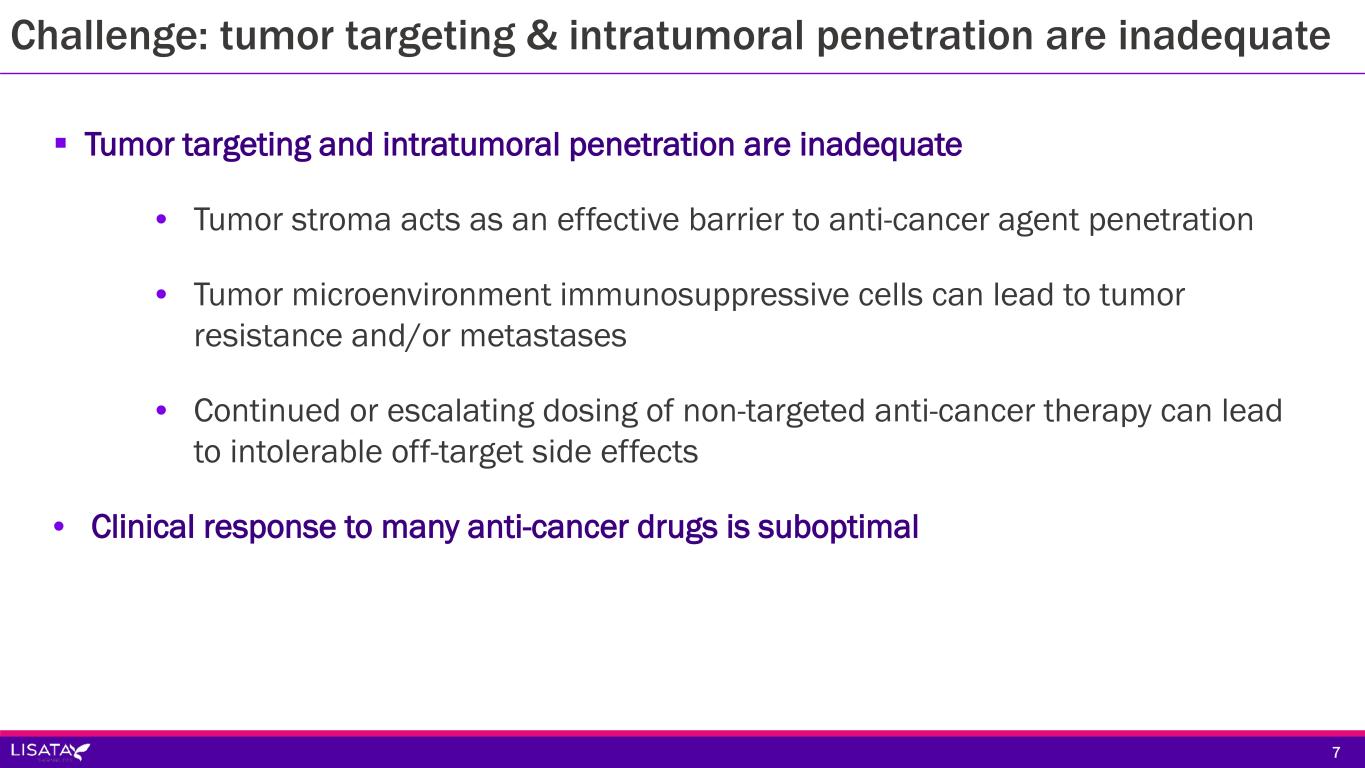  Tumor targeting and intratumoral penetration are inadequate • Tumor stroma acts as an effective barrier to anti-cancer agent penetration • Tumor microenvironment immunosuppressive cells can lead to tumor resistance and/or metastases • Continued or escalating dosing of non-targeted anti-cancer therapy can lead to intolerable off-target side effects • Clinical response to many anti-cancer drugs is suboptimal 7 Challenge: tumor targeting & intratumoral penetration are inadequate