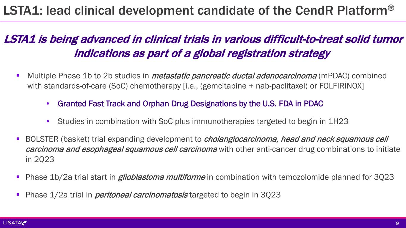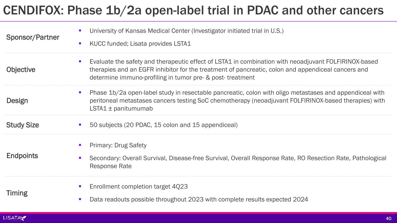 Sponsor/Partner  University of Kansas Medical Center (Investigator initiated trial in U.S.)  KUCC funded; Lisata provides LSTA1 Objective  Evaluate the safety and therapeutic effect of LSTA1 in combination with neoadjuvant FOLFIRINOX-based therapies and an EGFR inhibitor for the treatment of pancreatic, colon and appendiceal cancers and determine immuno-profiling in tumor pre- & post- treatment Design  Phase 1b/2a open-label study in resectable pancreatic, colon with oligo metastases and appendiceal with peritoneal metastases cancers testing SoC chemotherapy (neoadjuvant FOLFIRINOX-based therapies) with LSTA1 ± panitumumab Study Size  50 subjects (20 PDAC, 15 colon and 15 appendiceal) Endpoints  Primary: Drug Safety  Secondary: Overall Survival, Disease-free Survival, Overall Response Rate, RO Resection Rate, Pathological Response Rate Timing  Enrollment completion target 4Q23  Data readouts possible throughout 2023 with complete results expected 2024 4040 CENDIFOX: Phase 1b/2a open-label trial in PDAC and other cancers