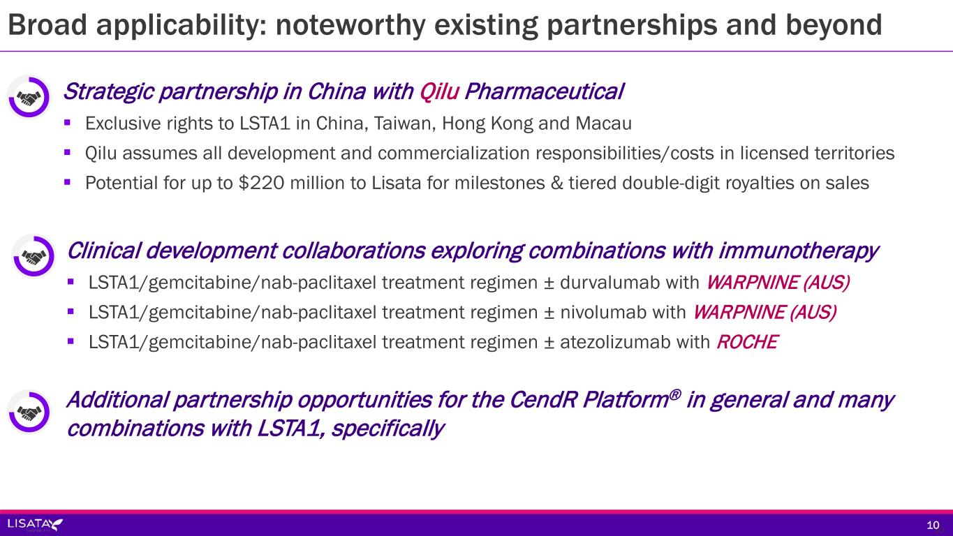 Broad applicability: noteworthy existing partnerships and beyond Strategic partnership in China with Qilu Pharmaceutical  Exclusive rights to LSTA1 in China, Taiwan, Hong Kong and Macau  Qilu assumes all development and commercialization responsibilities/costs in licensed territories  Potential for up to $220 million to Lisata for milestones & tiered double-digit royalties on sales Clinical development collaborations exploring combinations with immunotherapy  LSTA1/gemcitabine/nab-paclitaxel treatment regimen ± durvalumab with WARPNINE (AUS)  LSTA1/gemcitabine/nab-paclitaxel treatment regimen ± nivolumab with WARPNINE (AUS)  LSTA1/gemcitabine/nab-paclitaxel treatment regimen ± atezolizumab with ROCHE 10 Additional partnership opportunities for the CendR Platform® in general and many combinations with LSTA1, specifically 10