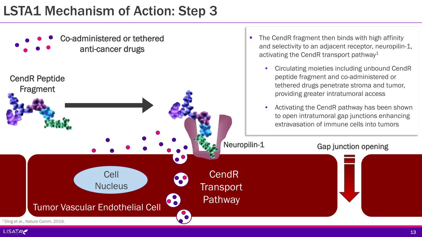 αvβ3/β5 integrin LSTA1 (Furin & others) Protease Cleavage CendR Peptide Fragment Tumor Vascular Endothelial Cell Cell Nucleus 12  LSTA1: 9 amino acid cyclic peptide; high binding specificity and affinity to αvβ3/β5 integrins that are upregulated on: • Tumor vascular endothelium • Tumor cells  Once bound to αvβ3/β5 integrins, LSTA1 is cleaved by proteases in the tumor microenvironment, releasing a C-end Rule (CendR) linear peptide fragment 12 LSTA1 Mechanism of Action: Steps 1 & 2