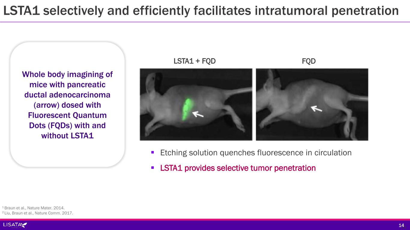 LSTA1 Mechanism of Action: Step 3 Neuropilin-1 CendR Peptide Fragment Co-administered or tethered anti-cancer drugs CendR Transport Pathway Tumor Vascular Endothelial Cell Cell Nucleus Gap junction opening 13  The CendR fragment then binds with high affinity and selectivity to an adjacent receptor, neuropilin-1, activating the CendR transport pathway1 • Circulating moieties including unbound CendR peptide fragment and co-administered or tethered drugs penetrate stroma and tumor, providing greater intratumoral access • Activating the CendR pathway has been shown to open intratumoral gap junctions enhancing extravasation of immune cells into tumors 13 1 Ding et al., Nature Comm, 2019.