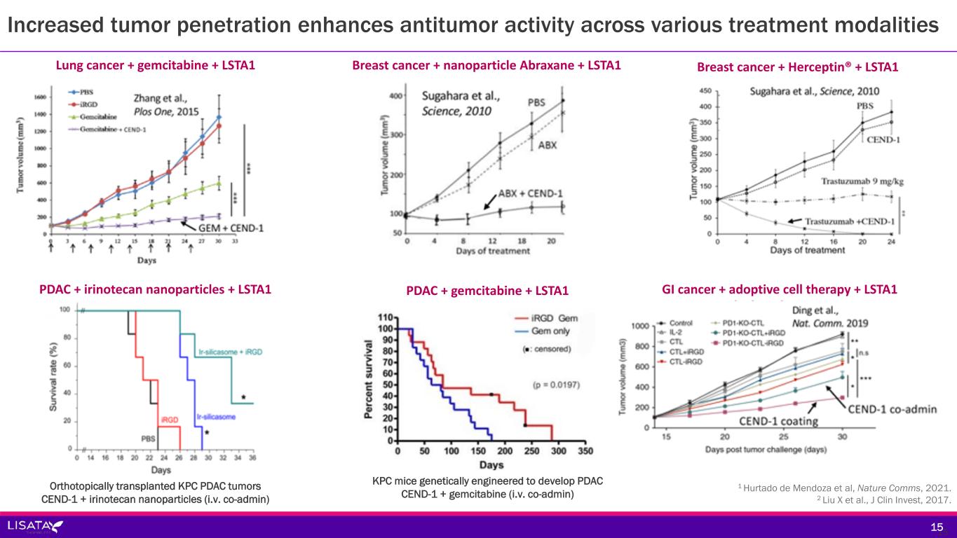 LSTA1 selectively and efficiently facilitates intratumoral penetration Whole body imagining of mice with pancreatic ductal adenocarcinoma (arrow) dosed with Fluorescent Quantum Dots (FQDs) with and without LSTA1 1 Braun et al., Nature Mater. 2014. 2 Liu, Braun et al., Nature Comm. 2017. 14  Etching solution quenches fluorescence in circulation  LSTA1 provides selective tumor penetration 14 LSTA1 + FQD FQD
