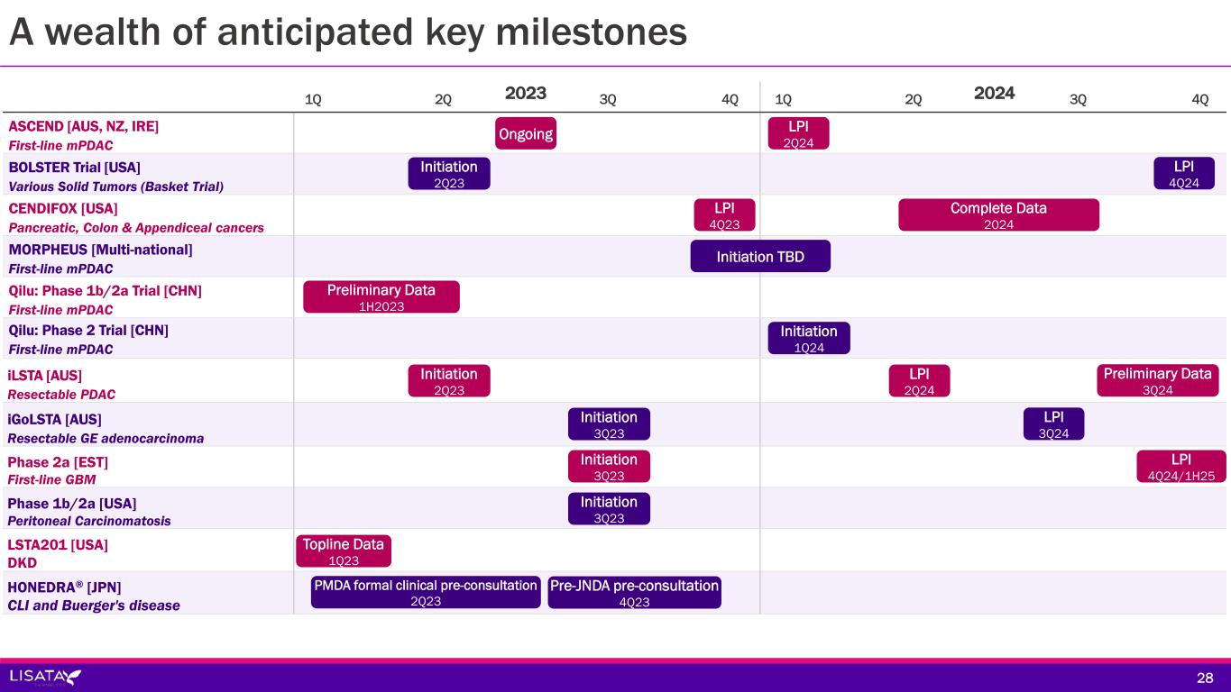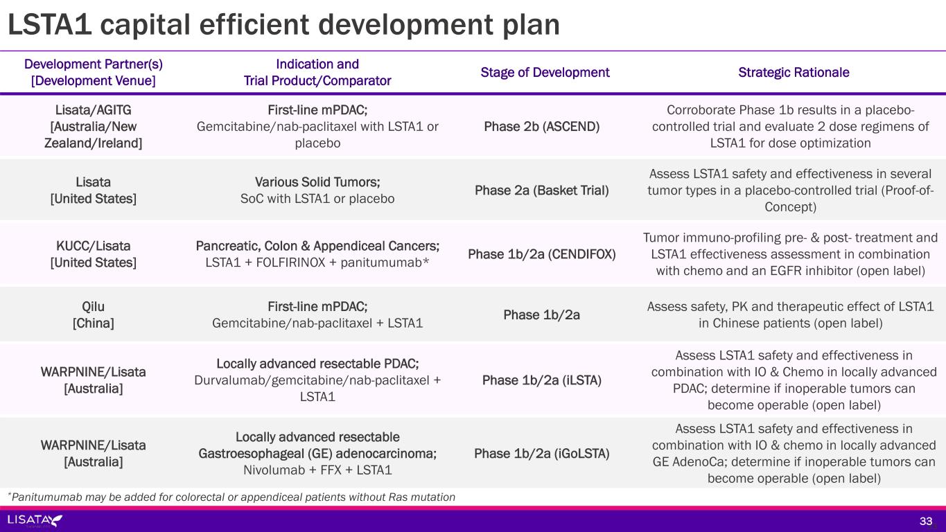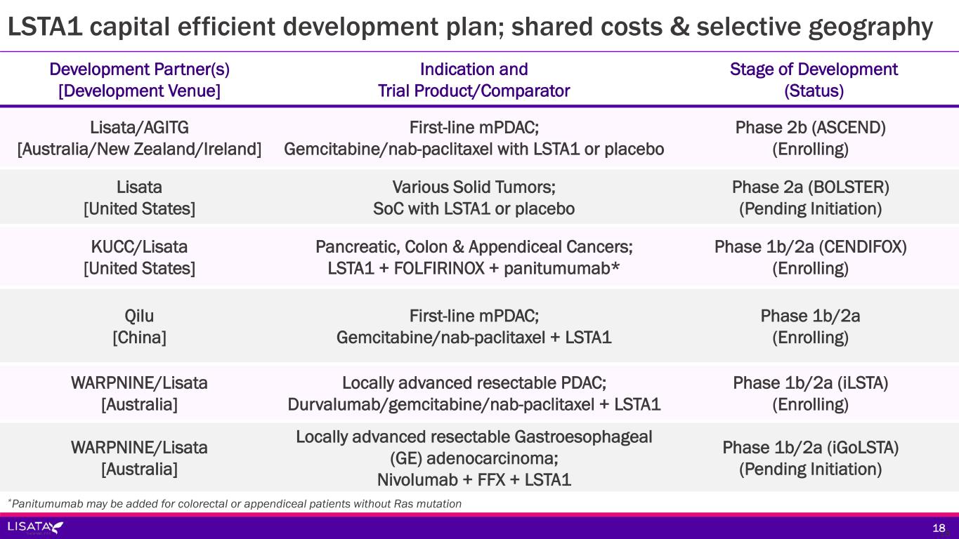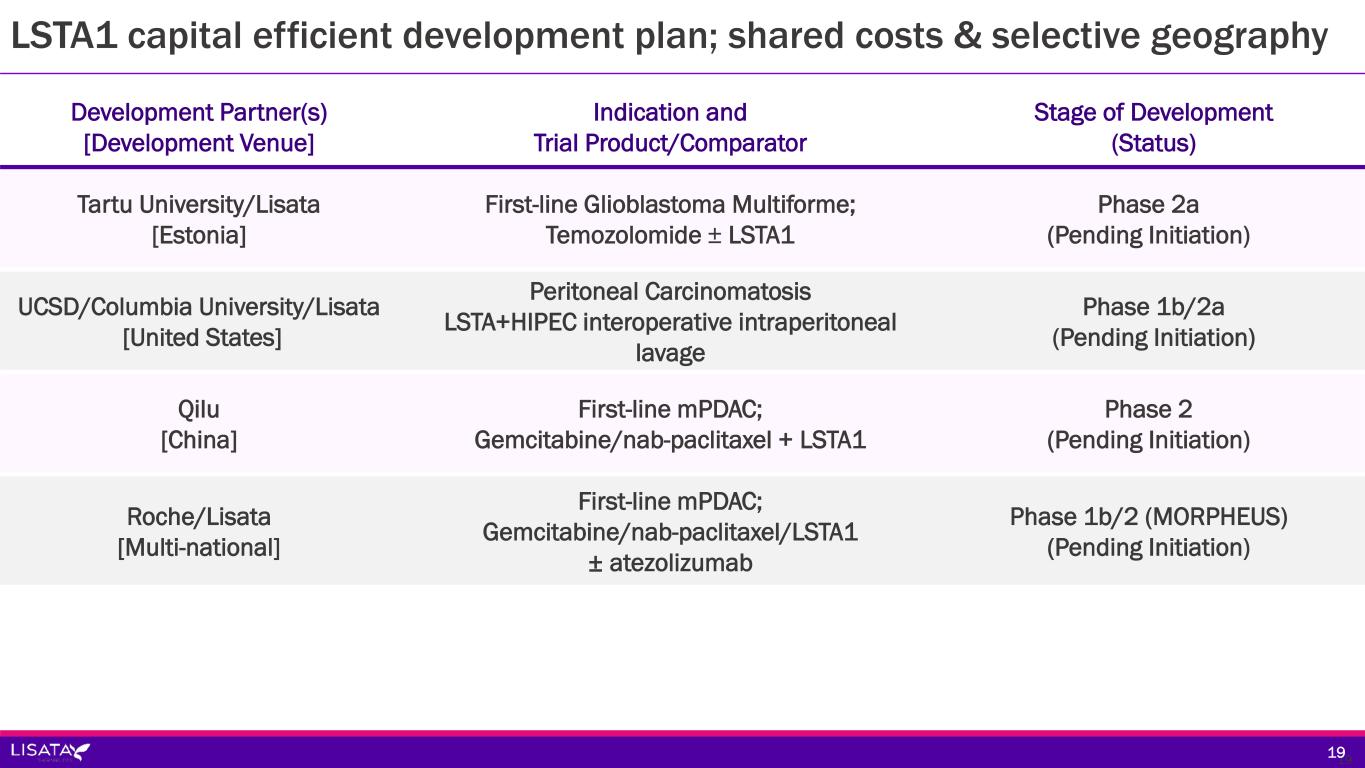 Development Partner(s) [Development Venue] Indication and Trial Product/Comparator Stage of Development (Status) Tartu University/Lisata [Estonia] First-line Glioblastoma Multiforme; Temozolomide ± LSTA1 Phase 2a (Pending Initiation) UCSD/Columbia University/Lisata [United States] Peritoneal Carcinomatosis LSTA+HIPEC interoperative intraperitoneal lavage Phase 1b/2a (Pending Initiation) Qilu [China] First-line mPDAC; Gemcitabine/nab-paclitaxel + LSTA1 Phase 2 (Pending Initiation) Roche/Lisata [Multi-national] First-line mPDAC; Gemcitabine/nab-paclitaxel/LSTA1 ± atezolizumab Phase 1b/2 (MORPHEUS) (Pending Initiation) LSTA1 capital efficient development plan; shared costs & selective geography 1919