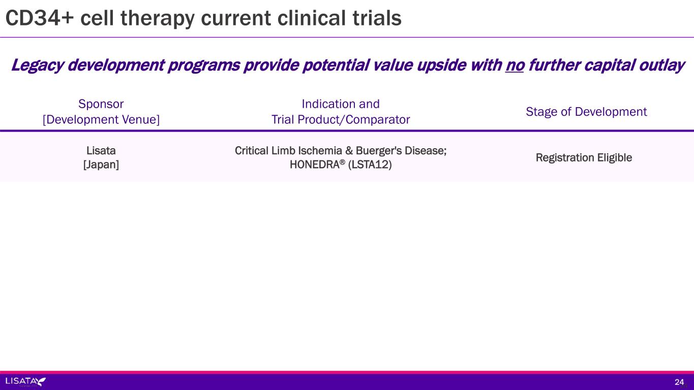 2424 Sponsor [Development Venue] Indication and Trial Product/Comparator Stage of Development Lisata [Japan] Critical Limb Ischemia & Buerger's Disease; HONEDRA® (LSTA12) Registration Eligible CD34+ cell therapy current clinical trials Legacy development programs provide potential value upside with no further capital outlay