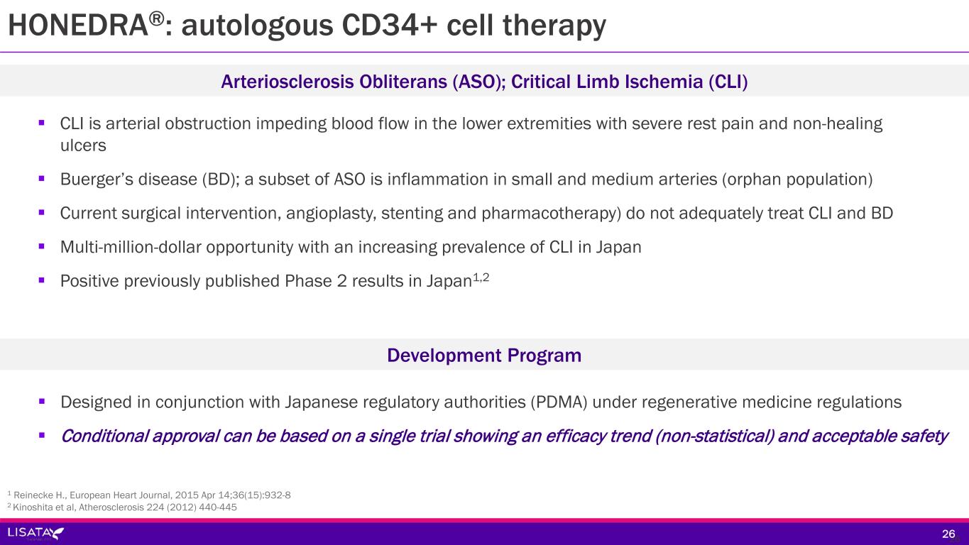 HONEDRA® [LSTA12 (formerly known as CLBS12)] Critical Limb Ischemia (Japan) SAKIGAKE designated – Japan Orphan Drug designated (Buerger’s disease) - USA Advanced Therapeutic Medicinal Product (ATMP) designated – EU