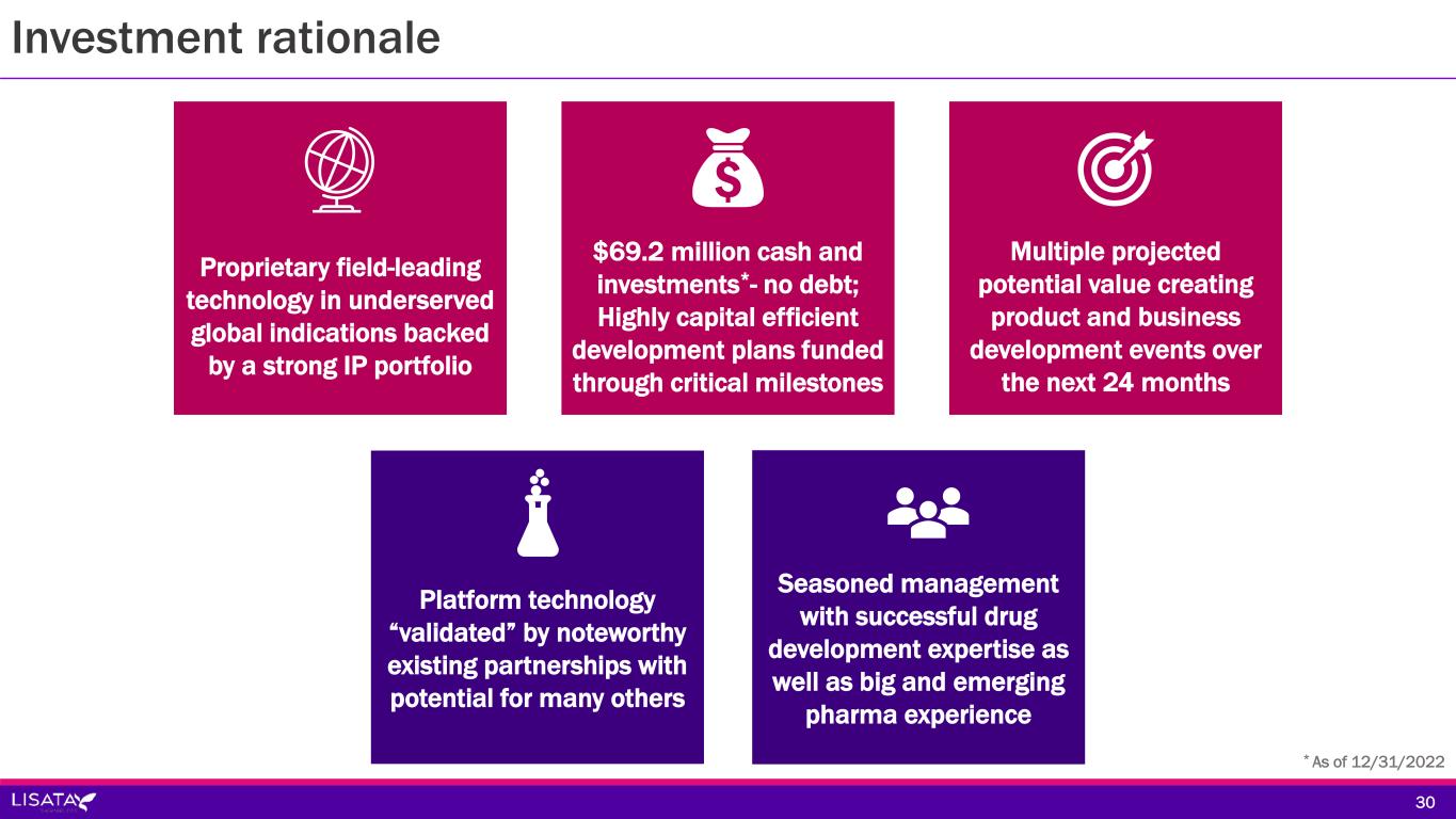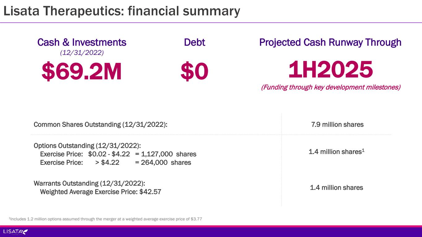 Lisata Therapeutics: financial summary $69.2M Cash & Investments (12/31/2022) $0 Debt 1H2025 (Funding through key development milestones) Projected Cash Runway Through Common Shares Outstanding (12/31/2022): 7.9 million shares Options Outstanding (12/31/2022): Exercise Price: $0.02 - $4.22 = 1,127,000 shares Exercise Price: > $4.22 = 264,000 shares 1.4 million shares1 Warrants Outstanding (12/31/2022): Weighted Average Exercise Price: $42.57 1.4 million shares 1Includes 1.2 million options assumed through the merger at a weighted average exercise price of $3.77