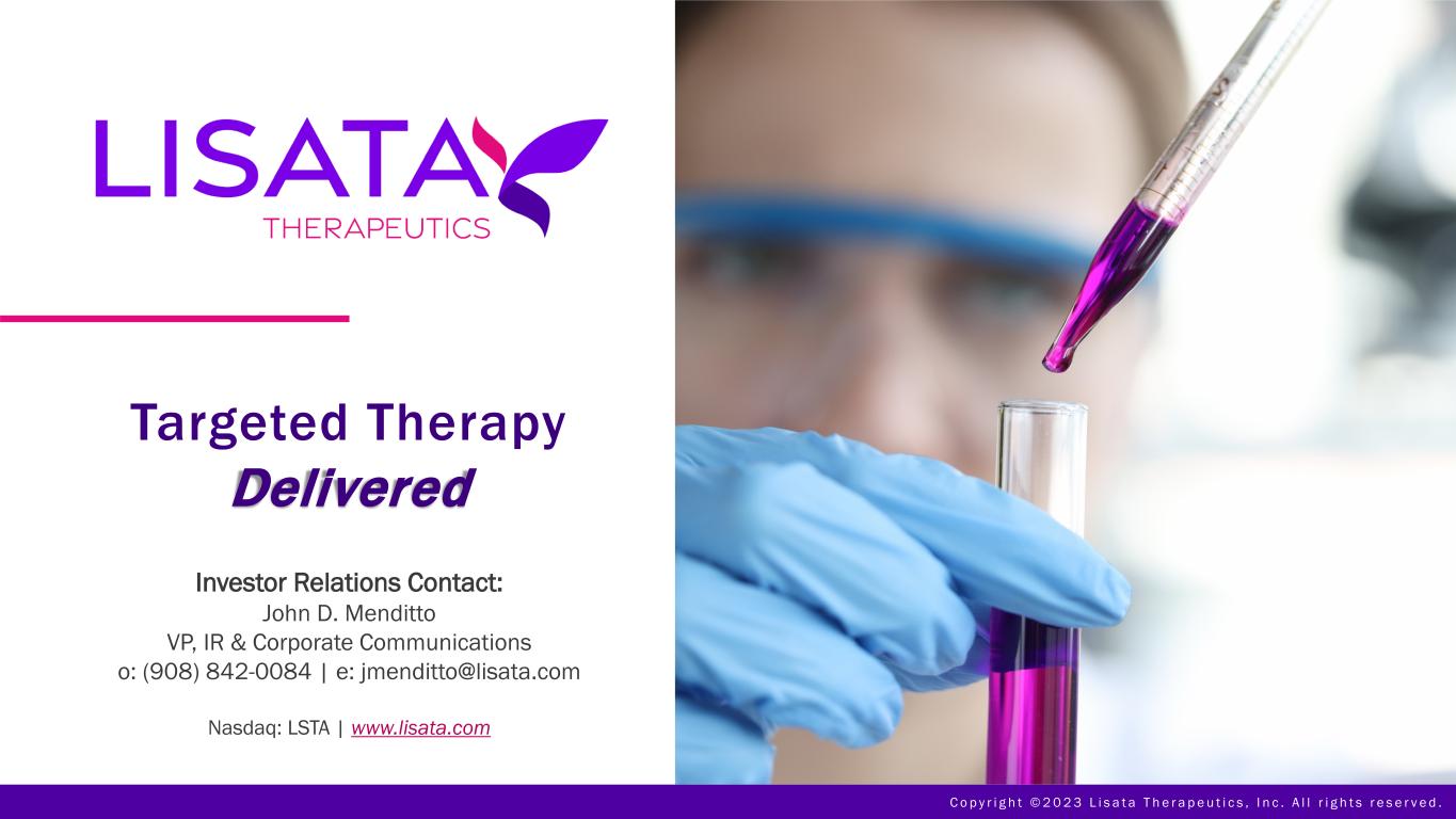 C o p y r i g h t © 2 0 2 3 L i s a t a T h e r a p e u t i c s , I n c . A l l r i g h t s r e s e r v e d . Targeted Therapy Delivered Investor Relations Contact: John D. Menditto VP, IR & Corporate Communications o: (908) 842-0084 | e: jmenditto@lisata.com Nasdaq: LSTA | www.lisata.com