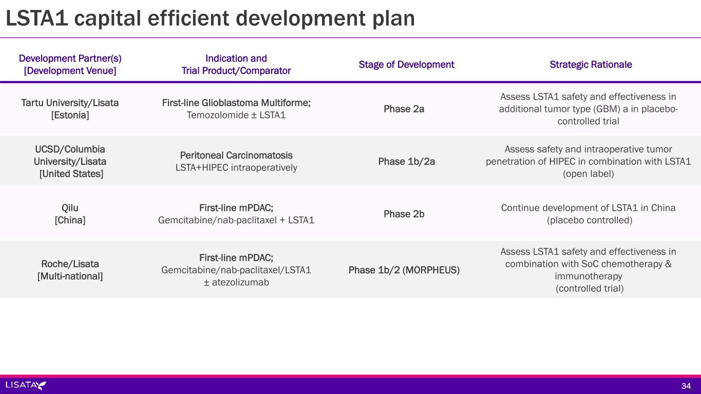 Development Partner(s) [Development Venue] Indication and Trial Product/Comparator Stage of Development Strategic Rationale Tartu University/Lisata [Estonia] First-line Glioblastoma Multiforme; Temozolomide ± LSTA1 Phase 2a Assess LSTA1 safety and effectiveness in additional tumor type (GBM) a in placebo- controlled trial UCSD/Columbia University/Lisata [United States] Peritoneal Carcinomatosis LSTA+HIPEC intraoperatively Phase 1b/2a Assess safety and intraoperative tumor penetration of HIPEC in combination with LSTA1 (open label) Qilu [China] First-line mPDAC; Gemcitabine/nab-paclitaxel + LSTA1 Phase 2b Continue development of LSTA1 in China (placebo controlled) Roche/Lisata [Multi-national] First-line mPDAC; Gemcitabine/nab-paclitaxel/LSTA1 ± atezolizumab Phase 1b/2 (MORPHEUS) Assess LSTA1 safety and effectiveness in combination with SoC chemotherapy & immunotherapy (controlled trial) LSTA1 capital efficient development plan 3434