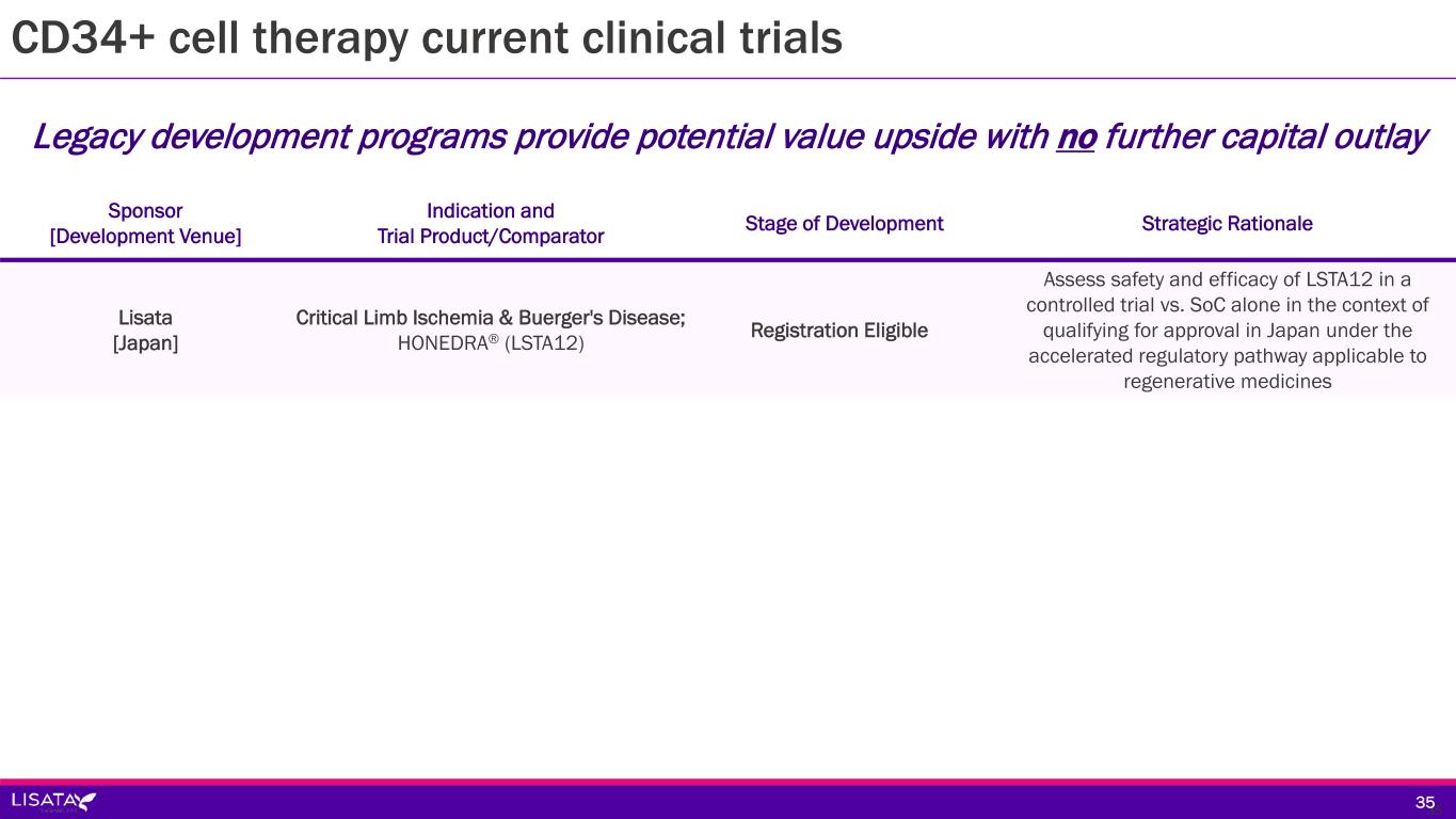 3535 Sponsor [Development Venue] Indication and Trial Product/Comparator Stage of Development Strategic Rationale Lisata [Japan] Critical Limb Ischemia & Buerger's Disease; HONEDRA® (LSTA12) Registration Eligible Assess safety and efficacy of LSTA12 in a controlled trial vs. SoC alone in the context of qualifying for approval in Japan under the accelerated regulatory pathway applicable to regenerative medicines CD34+ cell therapy current clinical trials Legacy development programs provide potential value upside with no further capital outlay