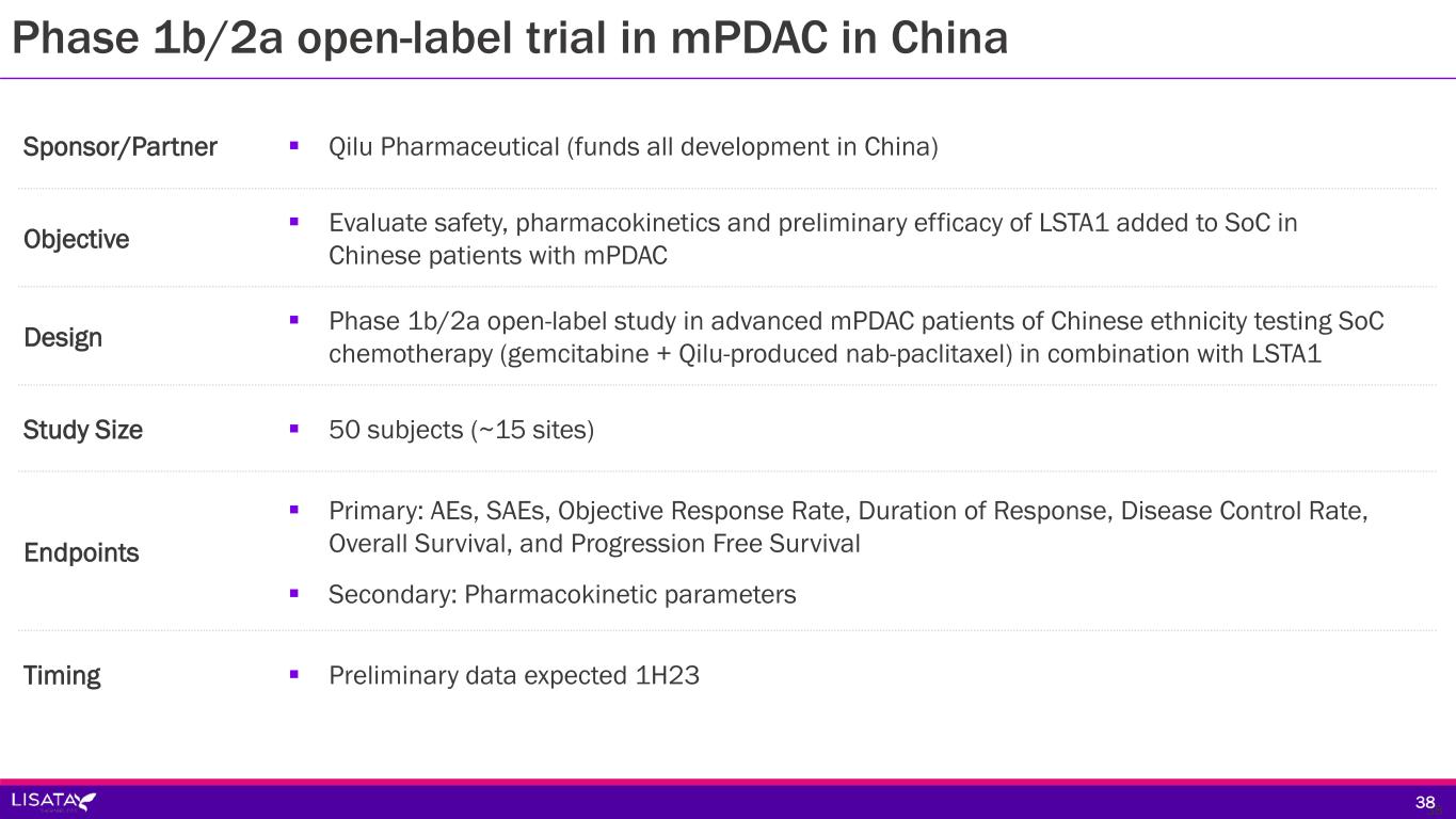 Sponsor/Partner  Qilu Pharmaceutical (funds all development in China) Objective  Evaluate safety, pharmacokinetics and preliminary efficacy of LSTA1 added to SoC in Chinese patients with mPDAC Design  Phase 1b/2a open-label study in advanced mPDAC patients of Chinese ethnicity testing SoC chemotherapy (gemcitabine + Qilu-produced nab-paclitaxel) in combination with LSTA1 Study Size  50 subjects (~15 sites) Endpoints  Primary: AEs, SAEs, Objective Response Rate, Duration of Response, Disease Control Rate, Overall Survival, and Progression Free Survival  Secondary: Pharmacokinetic parameters Timing  Preliminary data expected 1H23 3838 Phase 1b/2a open-label trial in mPDAC in China