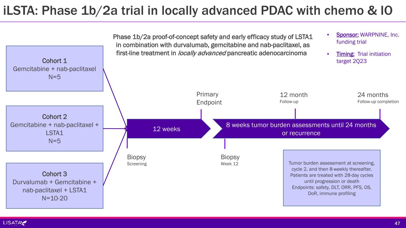 iLSTA: Phase 1b/2a trial in locally advanced PDAC with chemo & IO Sponsor/Partner  WARPNINE, Inc. (registered charity in Australia) is funding trial  Lisata providing study drug Objective  Evaluate safety and therapeutic effect of LSTA1 in combination with IO & Chemo in locally advanced PDAC; determine if inoperable tumors can become operable Design  Phase 1b/2a proof-of-concept safety and early efficacy study of LSTA1 in combination with durvalumab, gemcitabine and nab-paclitaxel, as first-line treatment in locally advanced pancreatic adenocarcinoma Study Size  N=30 Endpoints  Safety and tolerability; 28-day DLTs  Objective response rate, PFS, OS, duration of response, immune cell infiltration Timing  Trial initiation target 2Q23 46