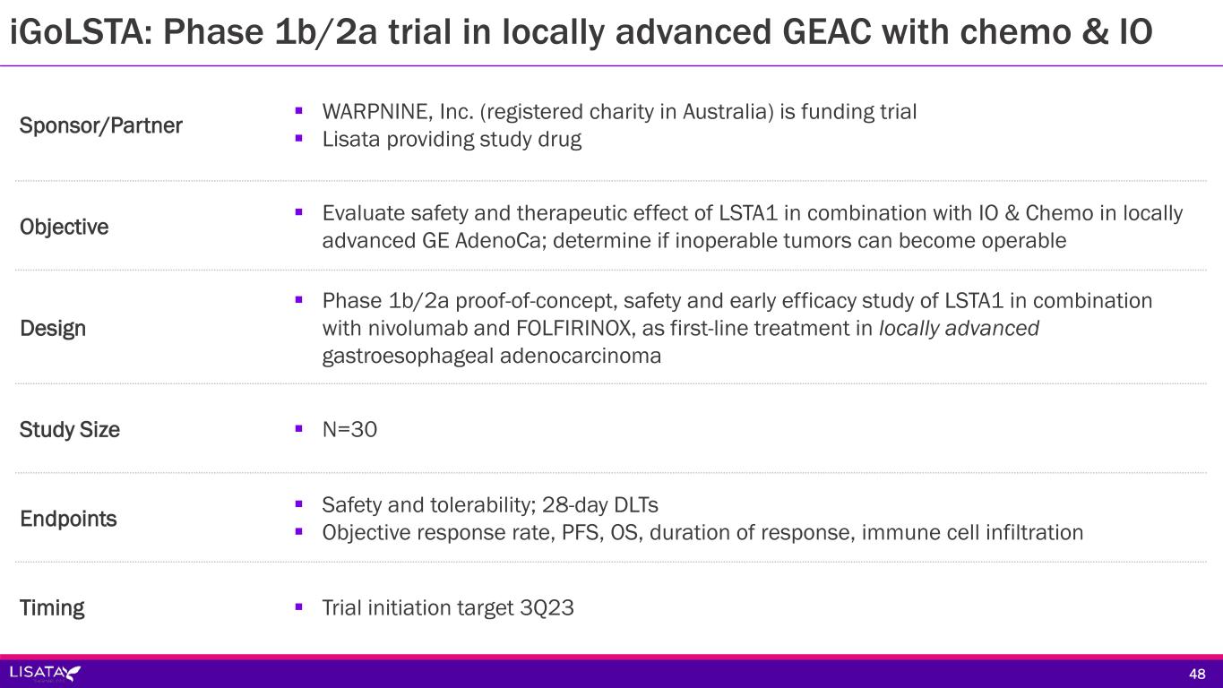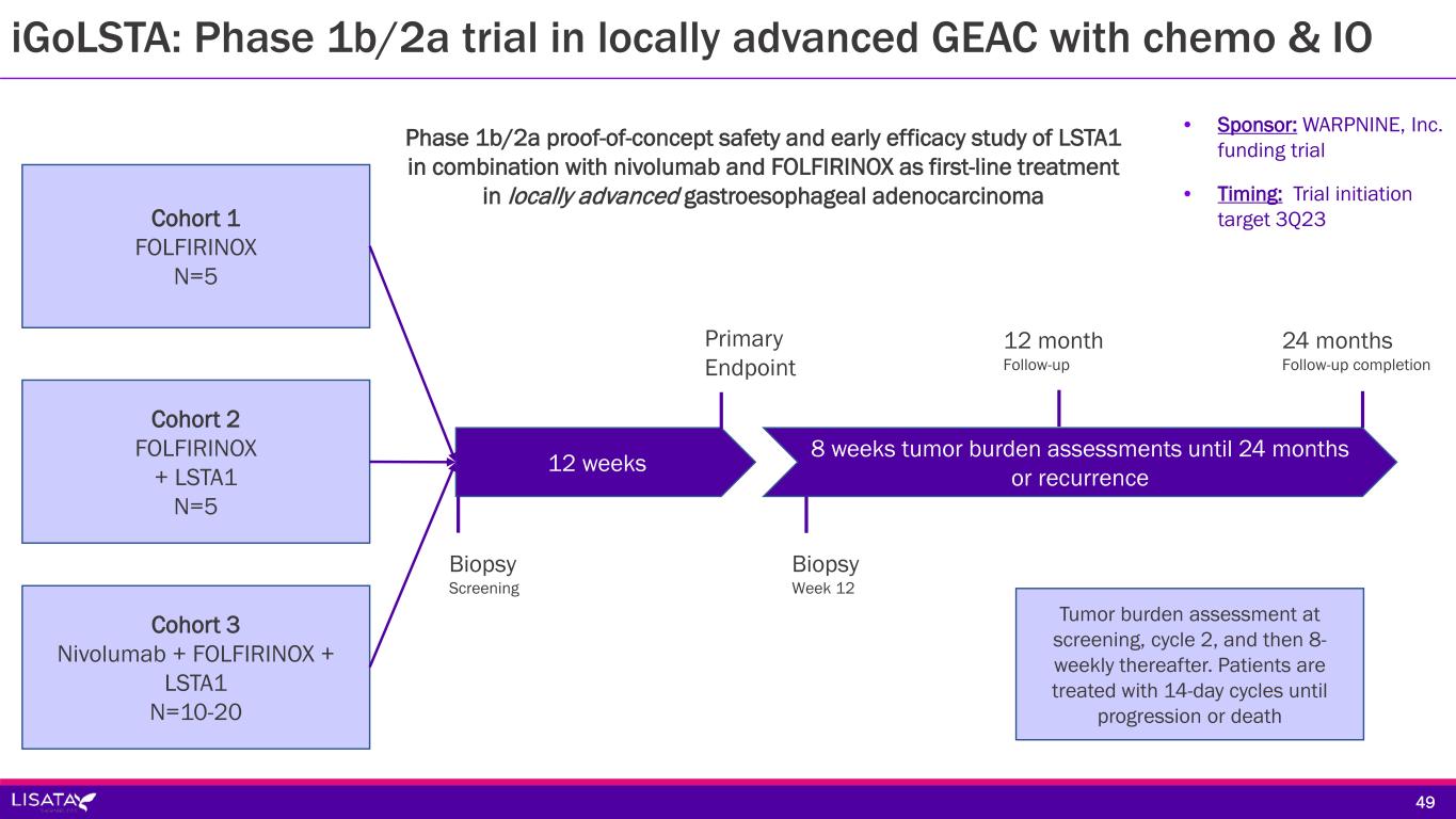 Sponsor/Partner  WARPNINE, Inc. (registered charity in Australia) is funding trial  Lisata providing study drug Objective  Evaluate safety and therapeutic effect of LSTA1 in combination with IO & Chemo in locally advanced GE AdenoCa; determine if inoperable tumors can become operable Design  Phase 1b/2a proof-of-concept, safety and early efficacy study of LSTA1 in combination with nivolumab and FOLFIRINOX, as first-line treatment in locally advanced gastroesophageal adenocarcinoma Study Size  N=30 Endpoints  Safety and tolerability; 28-day DLTs  Objective response rate, PFS, OS, duration of response, immune cell infiltration Timing  Trial initiation target 3Q23 48 iGoLSTA: Phase 1b/2a trial in locally advanced GEAC with chemo & IO