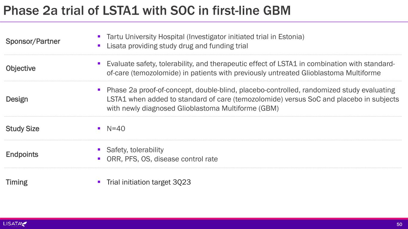 Sponsor/Partner  Tartu University Hospital (Investigator initiated trial in Estonia)  Lisata providing study drug and funding trial Objective  Evaluate safety, tolerability, and therapeutic effect of LSTA1 in combination with standard- of-care (temozolomide) in patients with previously untreated Glioblastoma Multiforme Design  Phase 2a proof-of-concept, double-blind, placebo-controlled, randomized study evaluating LSTA1 when added to standard of care (temozolomide) versus SoC and placebo in subjects with newly diagnosed Glioblastoma Multiforme (GBM) Study Size  N=40 Endpoints  Safety, tolerability  ORR, PFS, OS, disease control rate Timing  Trial initiation target 3Q23 50 Phase 2a trial of LSTA1 with SOC in first-line GBM