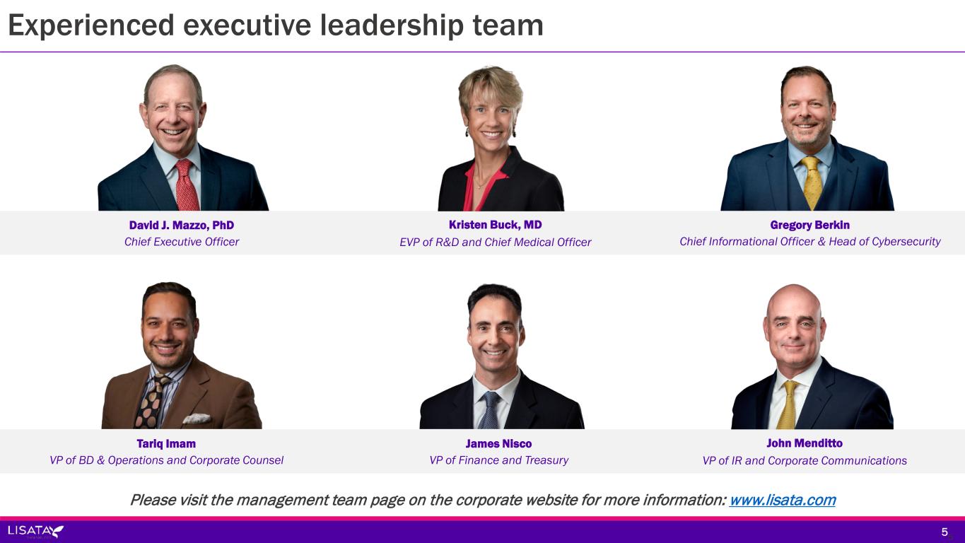 LISATA EUTICSTHERAP Nasdaq-listed clinical stage therapeutics development company with a novel solid tumor targeting and penetration technology to improve the efficacy of anti-cancer drugs 4 Lisata Therapeutics, Inc.