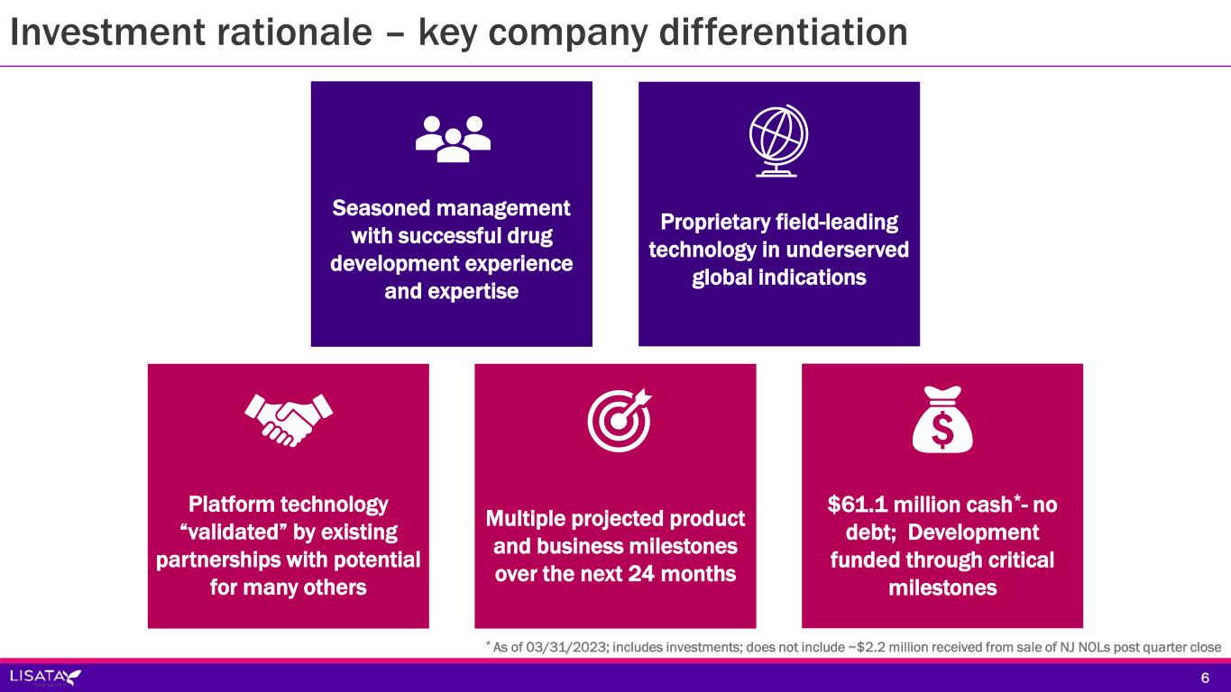 Experienced executive leadership team 5 David J. Mazzo, PhD Chief Executive Officer John Menditto VP of IR and Corporate Communications James Nisco VP of Finance and Treasury Kristen Buck, MD EVP of R&D and Chief Medical Officer Gregory Berkin Chief Informational Officer & Head of Cybersecurity 5 Tariq Imam VP of BD & Operations and Corporate Counsel Please visit the management team page on the corporate website for more information: www.lisata.com