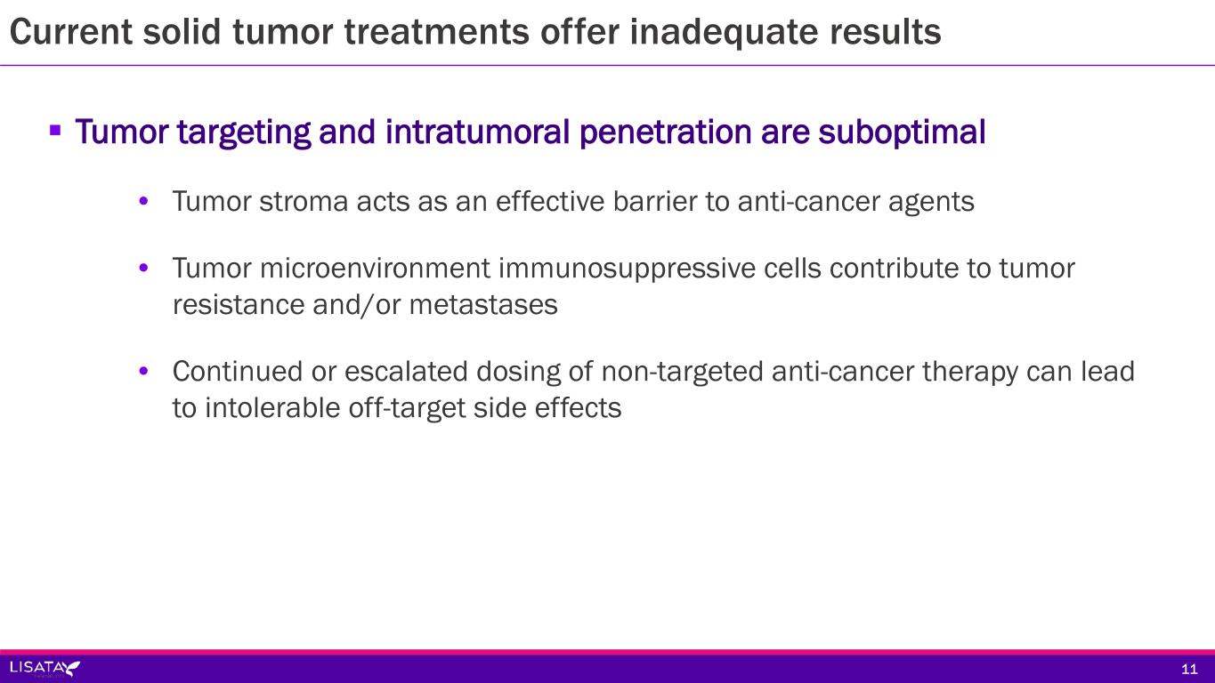 Solid tumor treatment is a large & growing market 1 CA A Cancer J Clinicians, Volume: 72, Issue: 1, Pages: 7-33, First published: 12 January 2022, DOI: (10.3322/caac.21708) 10 >1.9 million new cases of cancer will be diagnosed in 2022 In the U.S. alone, solid tumors account for >90% of new cancer cases Estimated New Cancer Cases and Deaths in the United States, 20221 Prostate 268,490 27% Lung & bronchus 117,910 12% Colon & rectum 80,690 8% Urinary bladder 61,700 6% Melanoma of the skin 57,180 6% Kidney & renal pelvis 50,290 5% Non-Hodgkin lymphoma 44,120 4% Oral cavity & pharynx 38,700 4% Leukemia 35,810 4% Pancreas 32,970 3% All sites 983,160 100% Breast 287,850 31% Lung & bronchus 118,830 13% Colon & rectum 70,340 8% Uterine corpus 65,950 7% Melanoma of the skin 42,600 5% Non-Hodgkin lymphoma 36,350 4% Thyroid 31,940 3% Pancreas 29,710 3% Kidney & renal pelvis 28,710 3% Leukemia 28,840 3% All sites 934,870 100% Lung & bronchus 68,820 21% Prostate 34,500 15% Colon & rectum 28,400 9% Pancreas 25,970 8% Liver & intrahepatic bile duct 20,420 6% Leukemia 14,020 4% Esophagus 13,250 4% Urinary bladder 12,120 4% Non-Hodgkin lymphoma 11,700 4% Brain & other nervous system 10,710 3% All sites 322,090 100% Lung & bronchus 61,360 21% Breast 43,250 15% Colon & rectum 24,180 8% Pancreas 23,860 8% Ovary 12,810 5% Uterine corpus 12,550 4% Liver & intrahepatic bile duct 10,100 4% Leukemia 9,980 3% Non-Hodgkin lymphoma 8,550 3% Brain & other nervous system 7,570 3% All sites 287,270 100%